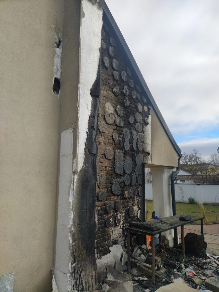 Sofort wurde eine Löschleitung vom Rüstlöschfahrzeug Matzen errichtet, sowie die Beleuchtung der Einsatzstelle vorgenommen. Durch die Kameraden der Feuerwehr Groß Schweinbarth wurde die Fassade auf einer Fläche von rund 10m² geöffnet und die brennenden sowie glosenden Dämmplatten abgelöscht und entfernt.