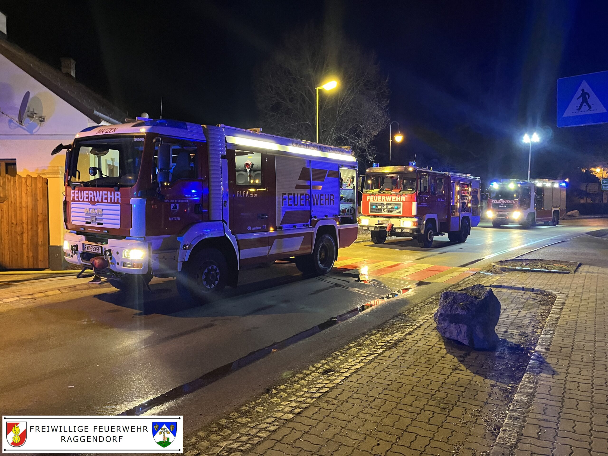 Am 3.2.2024 wurden um 2:32 Uhr die Feuerwehren Matzen, Raggendorf und Groß Schweinbarth mittels Sirene und Blaulicht-SMS zu einem Brandeinsatz (B2) in Matzen alarmiert.