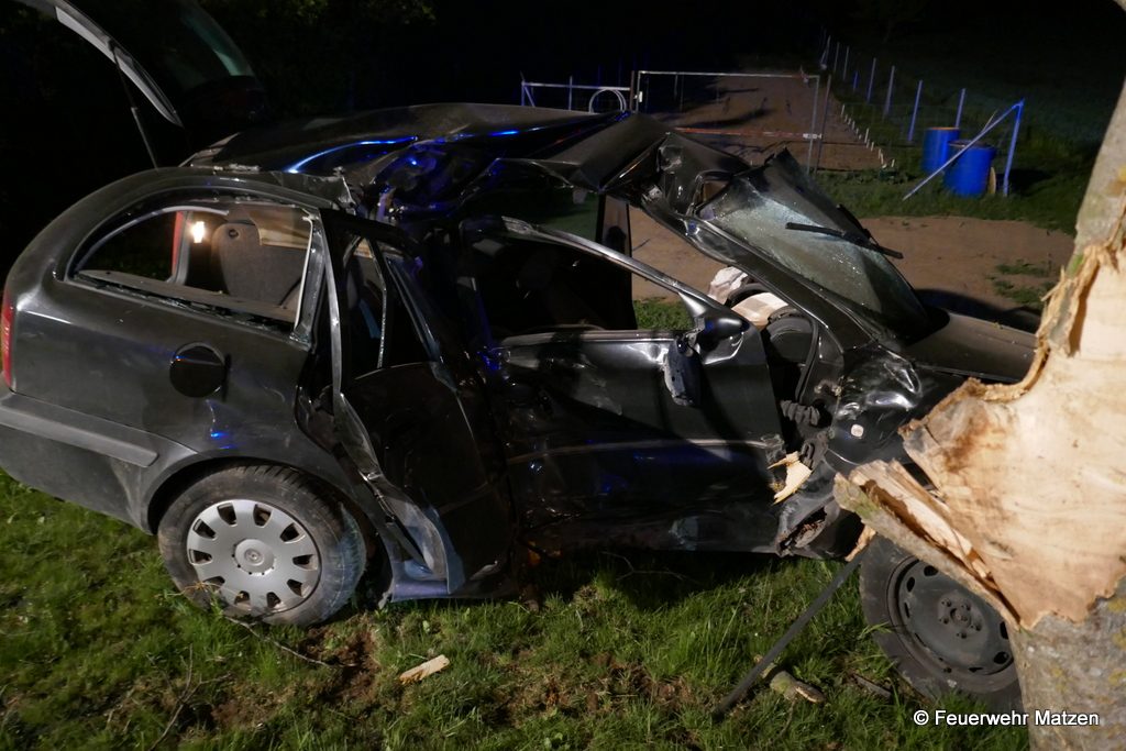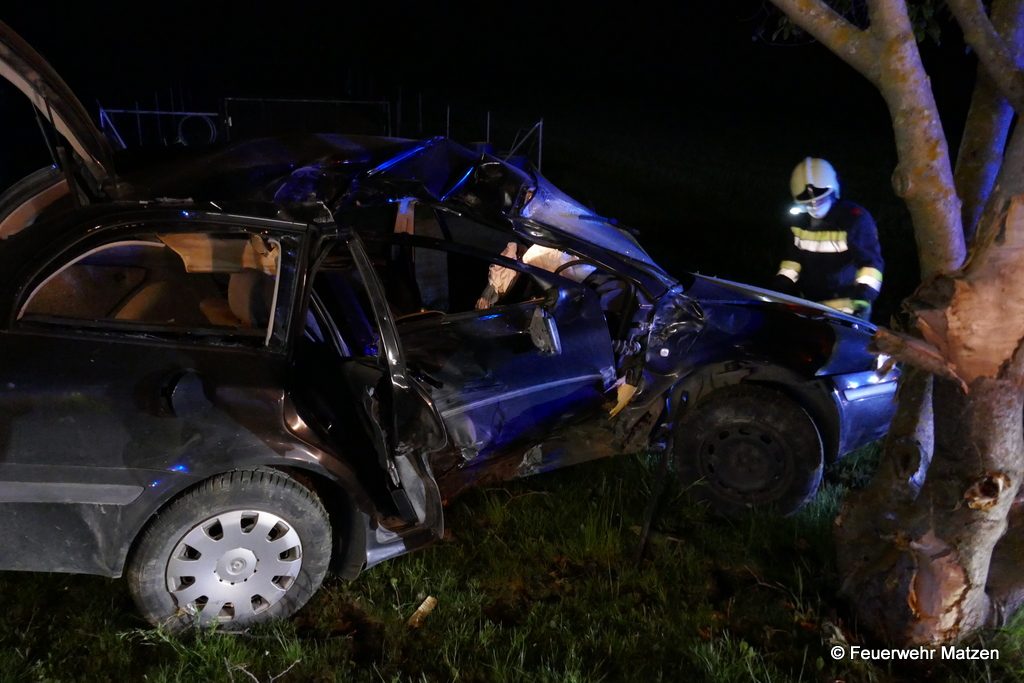 Ein PKW kam aus noch ungeklärter Ursache von der Fahrbahn und prallte mit voller Wucht beifahrerseitig gegen einen Baum. Der Fahrer konnte sich glücklicherweise selbst aus dem total zerstörtem Unfallfahrzeug befreien. Bei unserer Ankunft wurde er bereits vom Roten Kreuz und dem ebenfalls eingetroffenem Notarzt versorgt und anschließend in ein Krankenhaus abtransportiert. Nach der Absicherung der Einsatzstelle wurde unverzüglich der Brandschutz aufgebaut und die Batterie abgeklemmt. Nach der Freigabe durch die Polizei wurde das Unfallwrack mittels Abschleppachse auf einen von der Polizei zugewiesenen Platz verbracht. Nach rund 1 Stunde konnten alle Einsatzkräfte abrücken. Wieder im Feuerwehrhaus eingerückt wurde die Einsatzbereitschaft hergestellt und die Fahrzeuge desinfiziert.