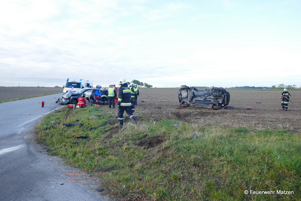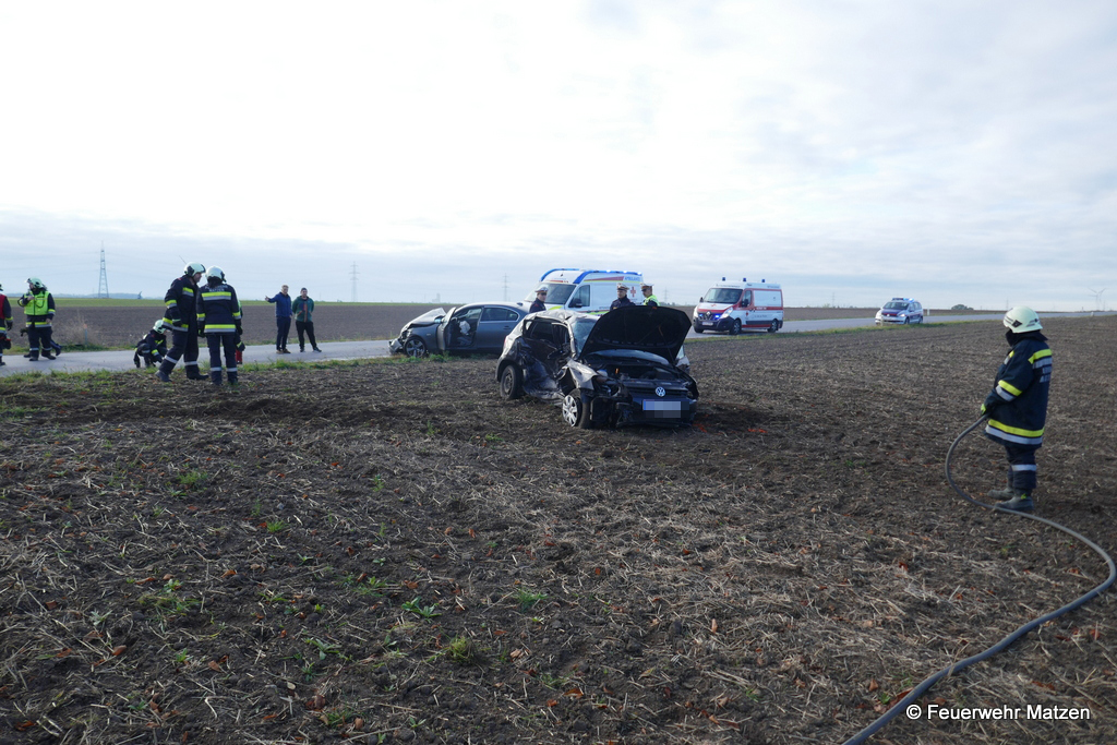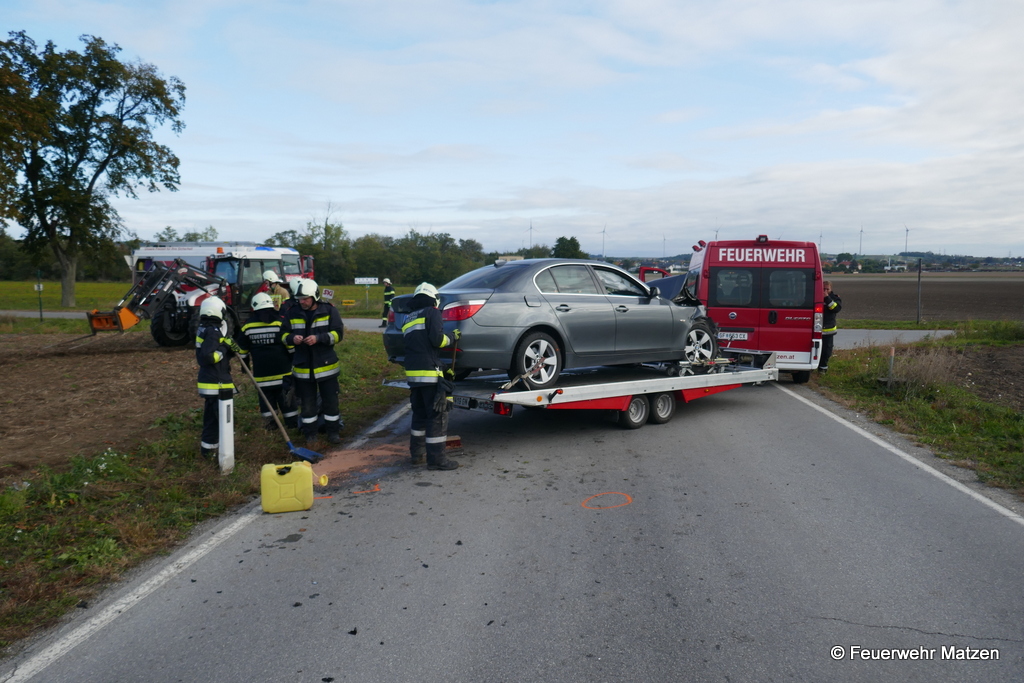 Am Unglücksort stellte sich heraus, dass zwei Pkws im Kreuzungsbereich zusammengestoßen waren.  Zwei Personen wurden verletzt vorgefunden. Da die Feuerwehr Matzen als erstes vor Ort eingetroffen war, sicherte wir unverzüglich die Einsatzstelle ab und bauten den Brandschutz auf. Die eingetroffenen Rettungskräfte versorgten zwischenzeitlich die Verletzten medizinisch. Während die Exekutivbeamten noch bei der Unfallaufnahme waren, wurden seitens unserer Feuerwehr bereits beide Fahrzeugbatterien abgeklemmt, das ausgeflossene Öl gebunden und die Verkehrsflächen für die Benutzung gereinigt und vorbereitet.