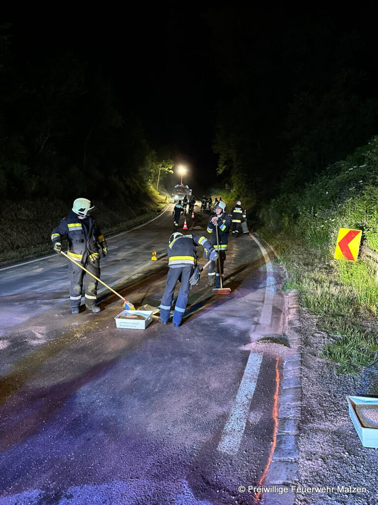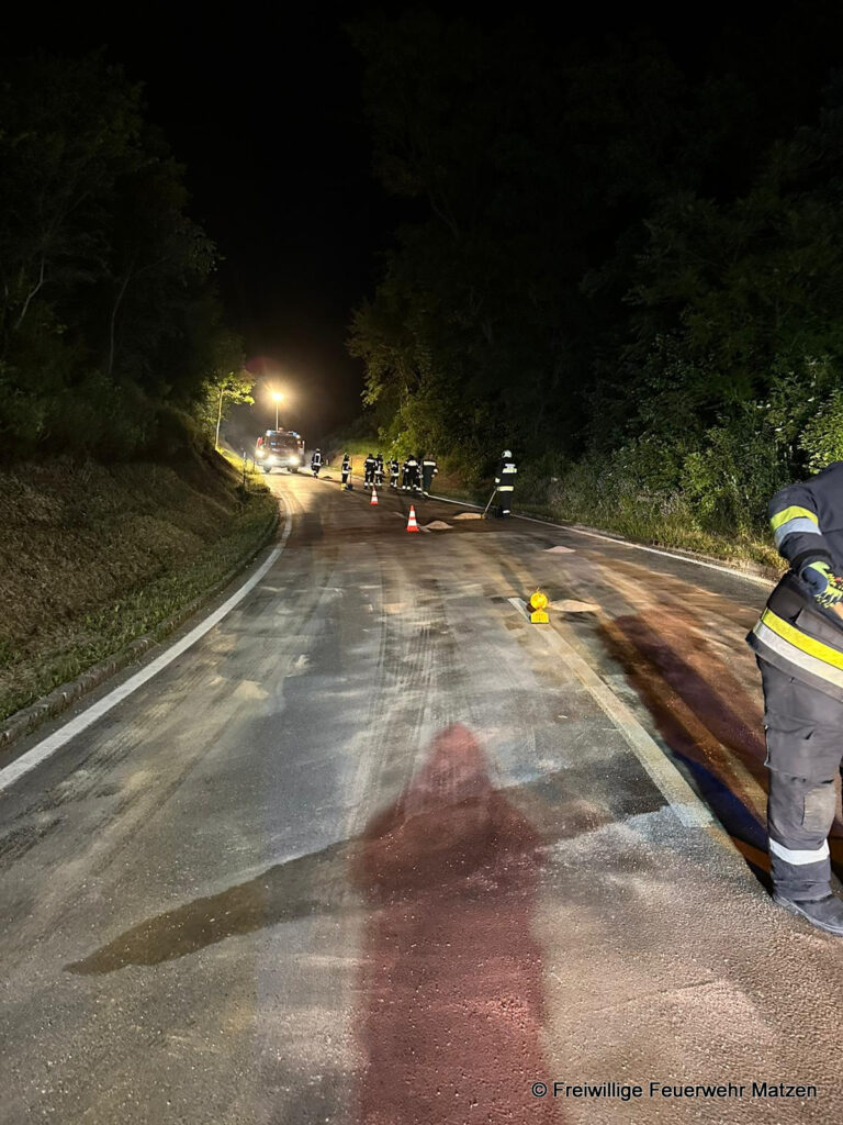 Am13.06.2023 wurde unsere Feuerwehr Matzen um 01:53 Uhr zu einer Ölspur auf der Spannbergerstraße (L 18) alarmiert. Ein Fahrzeug hatte in der Kurve Frittieröl verloren.