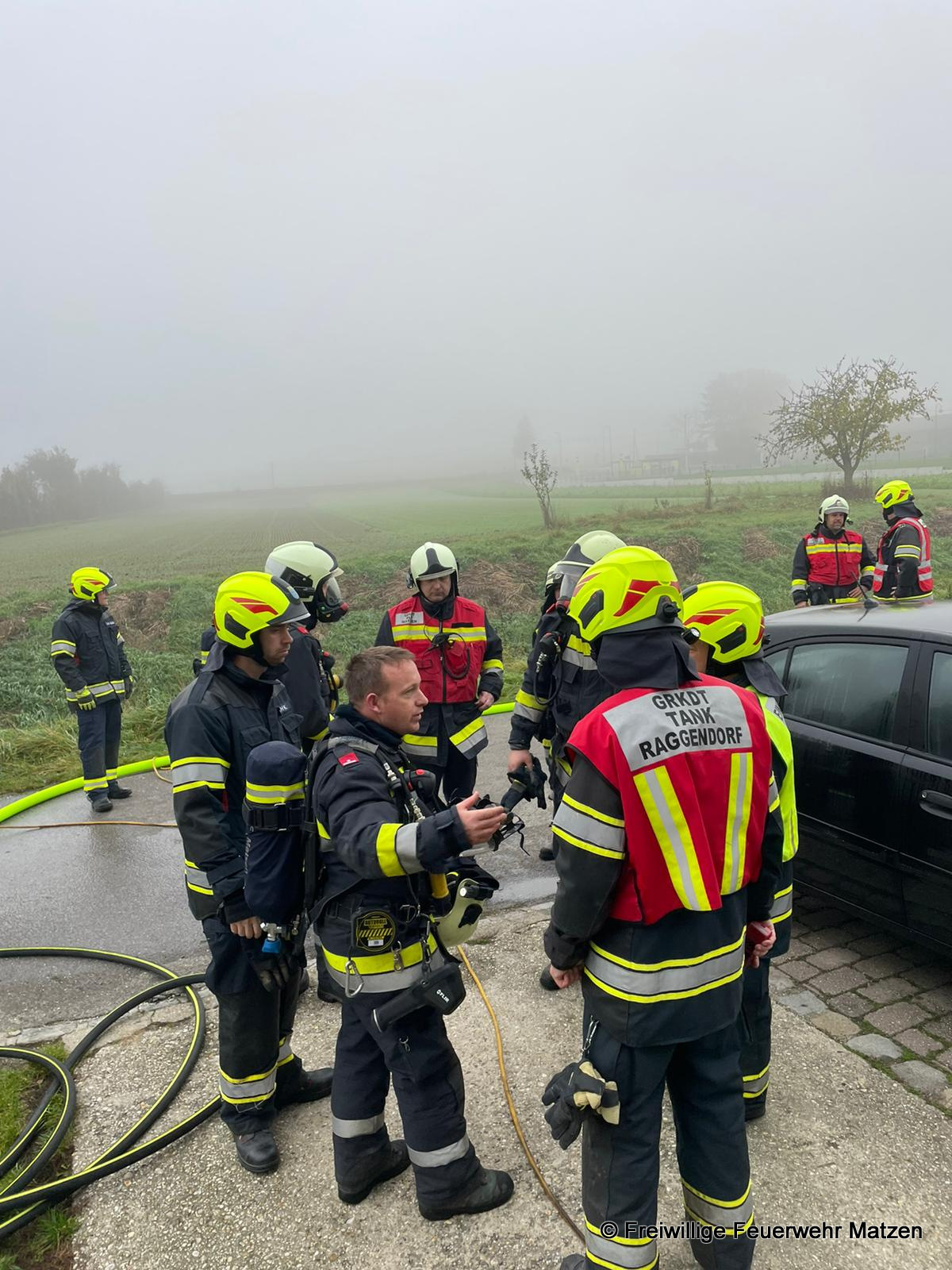 Bereits kurz nach der Alarmierung rückten insgesamt 15 Mann der FF Matzen mit dem Rüstlöschfahrzeug (RLF 2000), dem Kommandofahrzeug (KDO) und dem Einsatzleitfahrzeug (ELF) zum Einsatzort in Raggendorf aus.