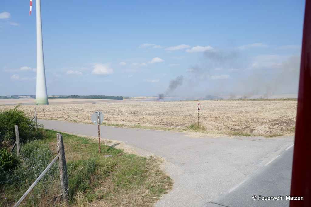 Bei Drescharbeiten war auf einem Feld eine Fläche von 15 bis 20 ha in Brand geraten. Der Landwirt konnte den Mähdrescher glücklicherweise noch rechtzeitig gesichert abstellen. Wegen des sehr starken Windes und der raschen Brandausbreitung musste aber über die BAZ Mistelbach die Erhöhung der Alarmstufe auf B3 und damit die Nachalarmierung weiterer Feuerwehren zur Brandbekämpfung veranlasst werden.