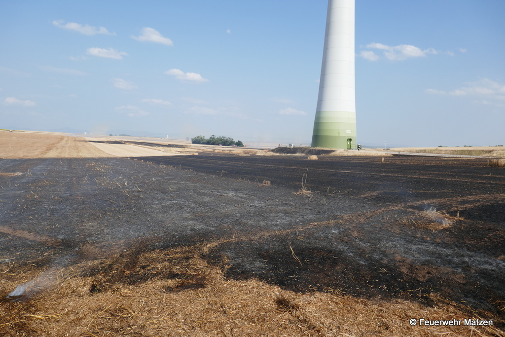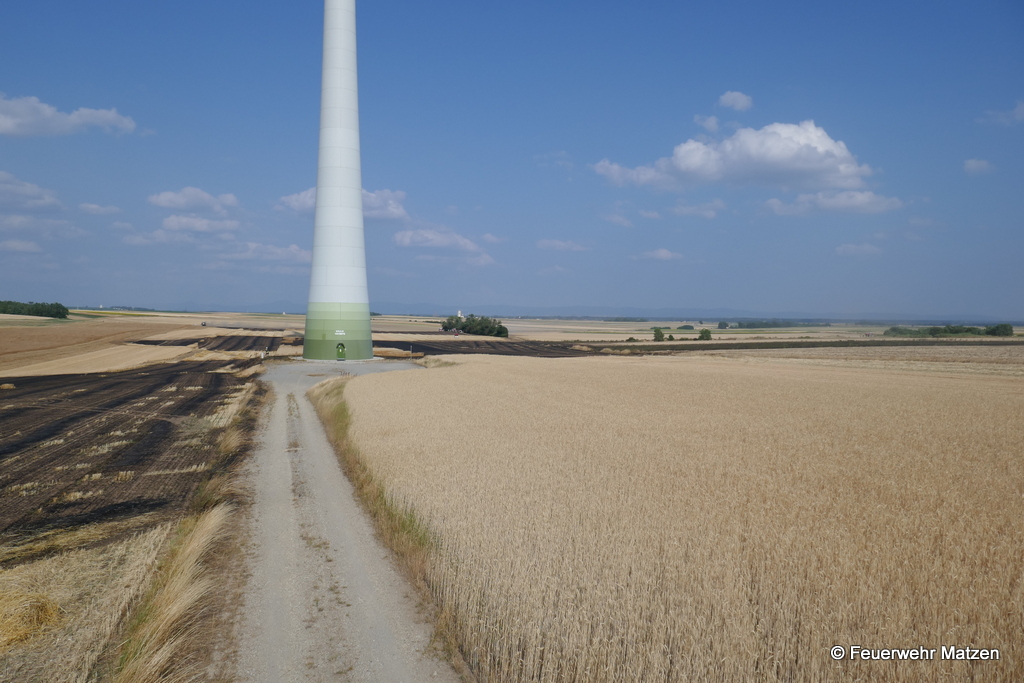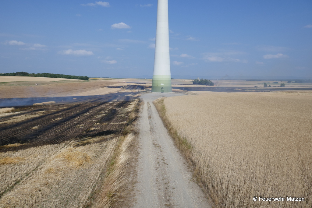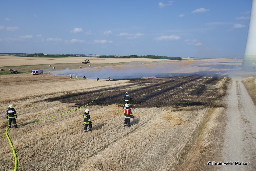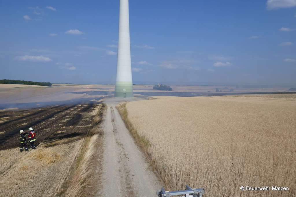 Abschnittsfeuerwehrkommandant BR Schuller Reinhard traf ebenfalls an der Einsatzstelle ein und half beim Koordinieren der Einsatzkräfte. Mittels zweier C-Rohre, unserer Feuerpatsche und dem Schanzwerkzeug nahm auch die Feuerwehr Matzen den Kampf gegen die Flammen auf. Wichtige Aufgabe war es, das angrenzende Windrad zu schützen und die Ausbreitung des Brandes so schnell wie möglich zu verhindern. Wegen der schnellen Brandausbreitung kamen auch Bauern mit Grubbern und Scheibeneggen zur Hilfe.