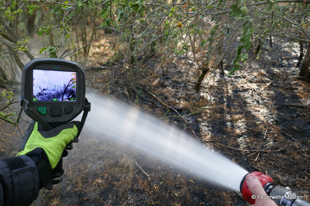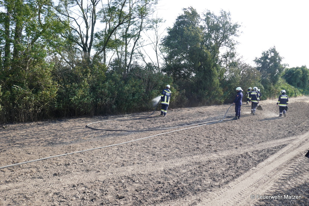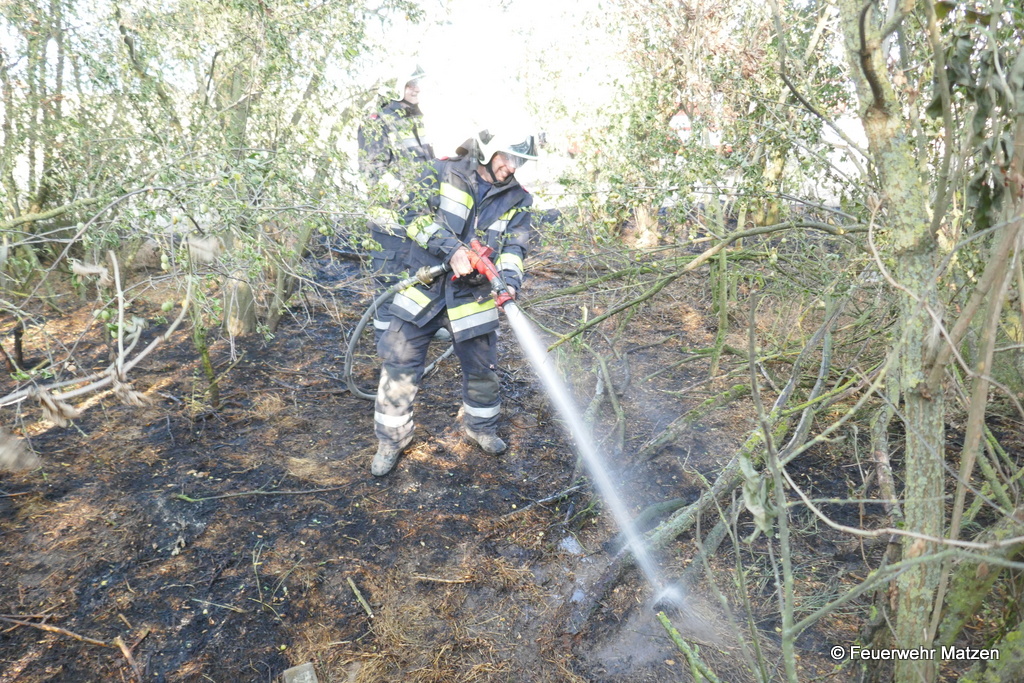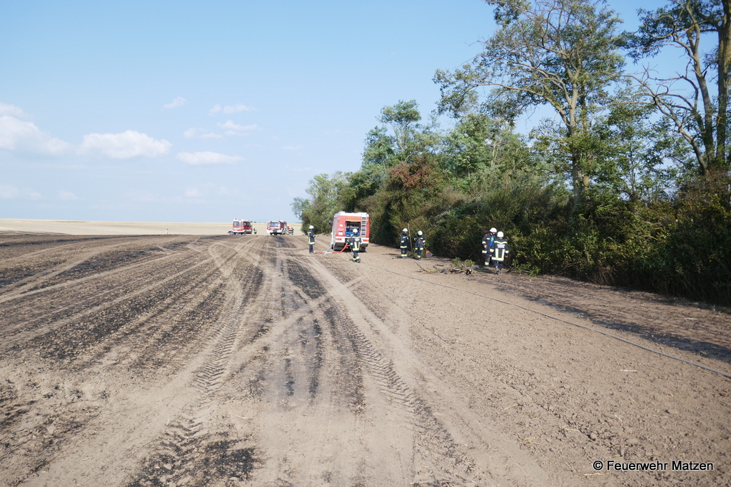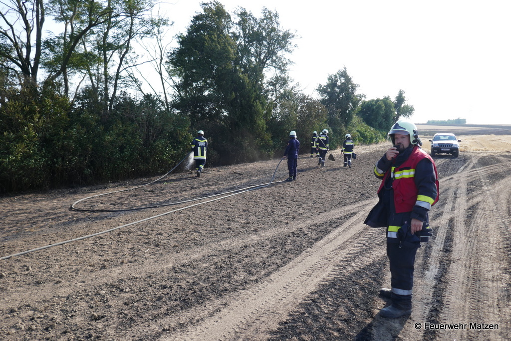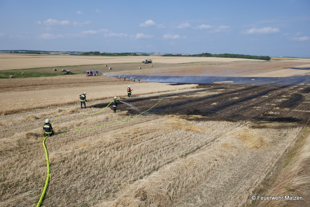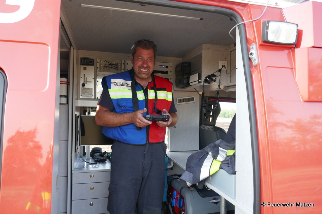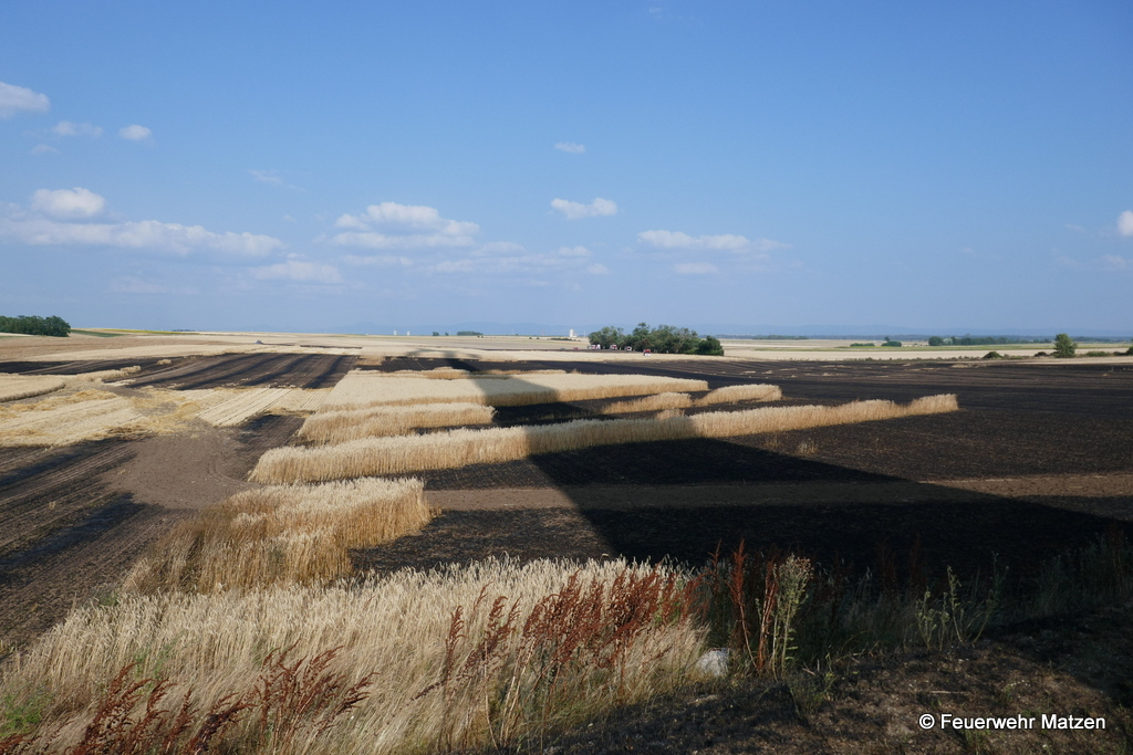 Auch die Drohne des Bezirksfeuerwehrkommandos, die in unserer Feuerwehr stationiert ist, wurde von der Feuerwehr Matzen zur Brandbeobachtung eingesetzt und ebenso wurde eine Brandsicherheitswache zur Beobachtung der Brandentwicklung eingerichtet. Ein benachbarter Windschutzgürtel musste ebenfalls geschützt und kontrolliert werden. Hier wurden immer wieder Glutnester entdeckt, welche abgelöscht werden musste. Die Feuerwehr Matzen hat dem Löschwasser ein sogenanntes „Netzmittel“ beigefügt, dies hat gegenüber unvermischtem Wasser den Vorteil, dass es die Oberflächenspannung bricht und somit tiefer in den Brandherd eindringen kann.