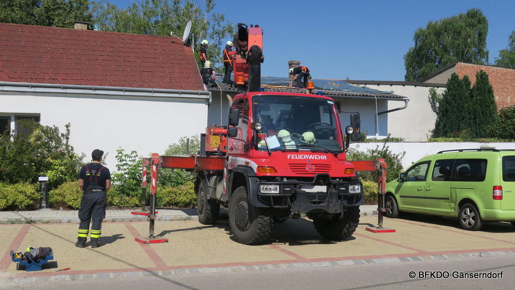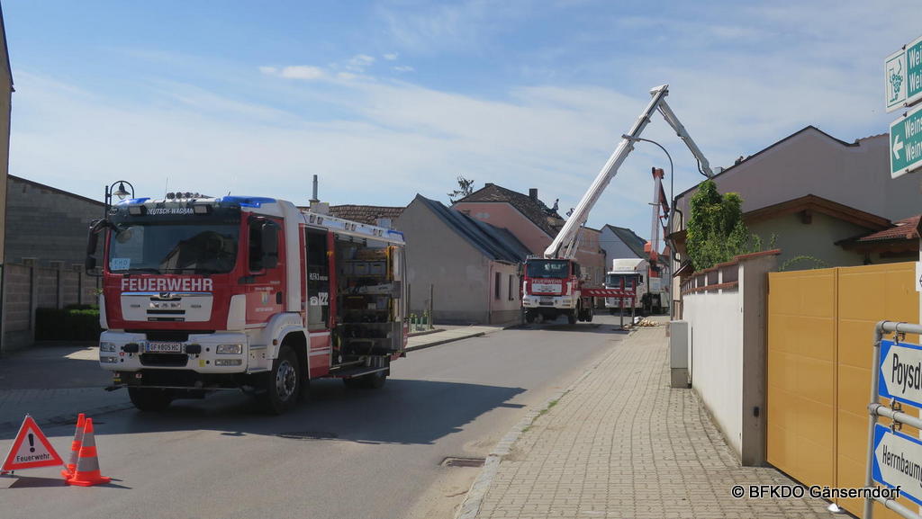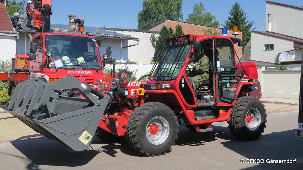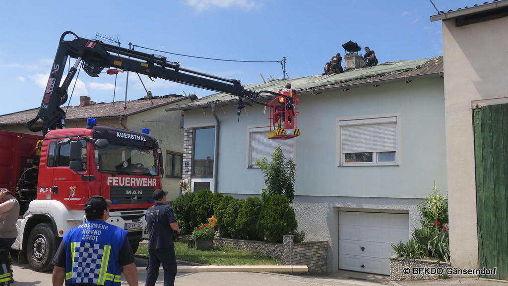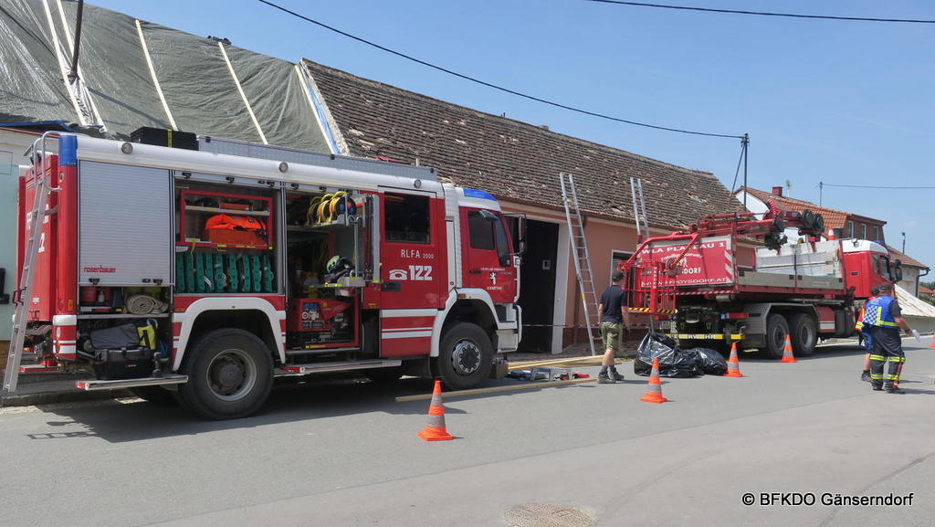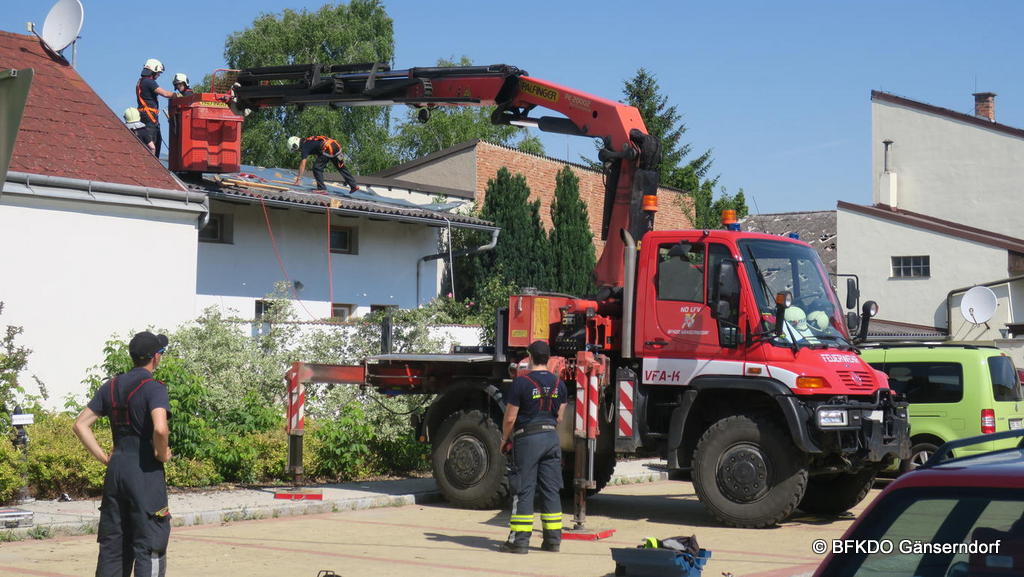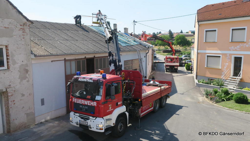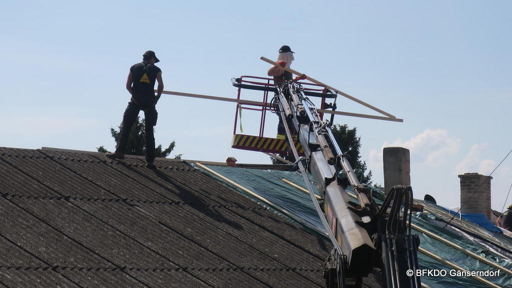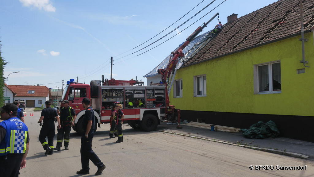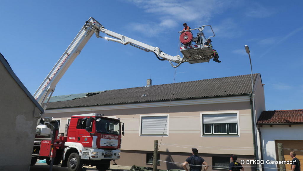 Hauptaufgabe der einzelnen Feuerwehren war es die Dächer, welche vom Hagel schwer in Mitleidenschaft gezogen waren, behelfsmäßig abzudichten, um weitere Schäden an den Häusern und der Bausubstanz zu verhindern. Hierbei kamen die mitgebrachten Sondergeräte des KHD Gänserndorf zum Einsatz: die Teleskopmastbühne, der Telelader, der LAST und der Tieflader um nur einige zu nennen.