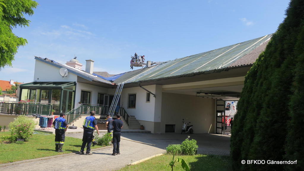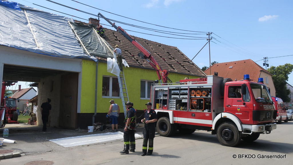 Feuerwehrkräfte aus dem Bezirk Gänserndorf unterstützten im Rahmen des Katastrophenhilfsdienstes (KHD) im Einsatzbereich von Schrattenberg am 28. Juni 2021 die örtlichen Feuerwehren, um beschädigte Dächer zu schließen und eine Vergrößerung des Schadens zu verhindern.