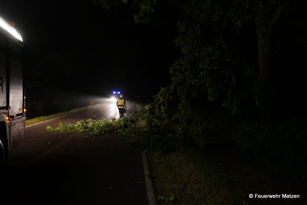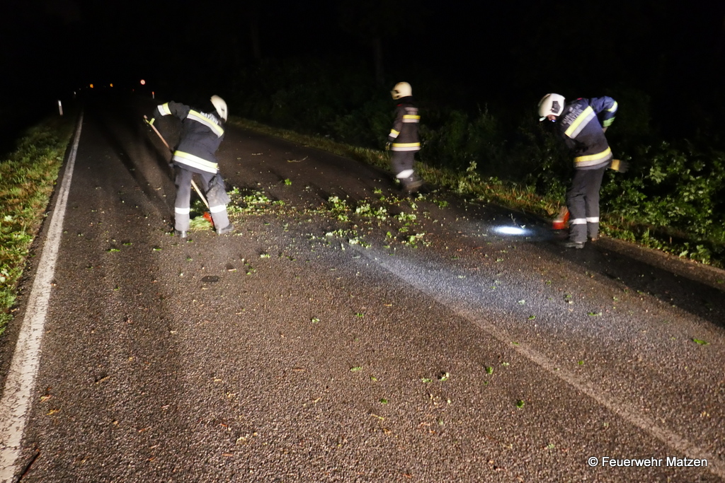 Am 28. Juli 2020 wurde die Feuerwehr Matzen um 21:33 mittels Sirene, BlaulichtSMS und Pager zu einem Sturmschaden mit dem Zusatztext Baum über Straße auf der L18 Richtung Spannberg alarmiert. Unverzüglich rückten 20 Mann mit 2 Fahrzeugen zum Einsatzort aus. Kurz vor der Kreuzung Richtung Hohenruppersdorf wurde der Schadensort vorgefunden. Ein zum Teil abgebrochener Ast versperrte die Fahrbahn. Das Hindernis wurde in den angrenzenden Graben gezogen und die Fahrbahn gereinigt. Nach rund einer halben Stunde konnten die Einsatzkräfte wieder einrücken und die Einsatzbereitschaft herstellen.
