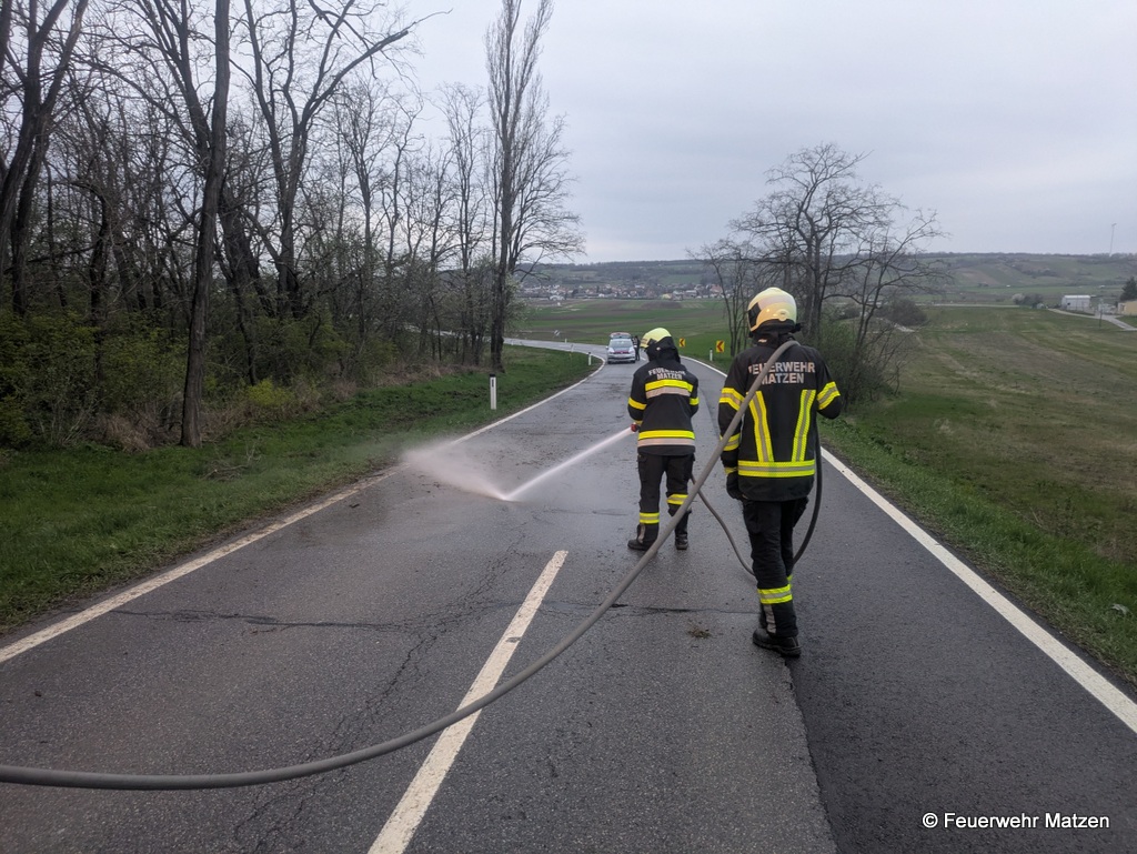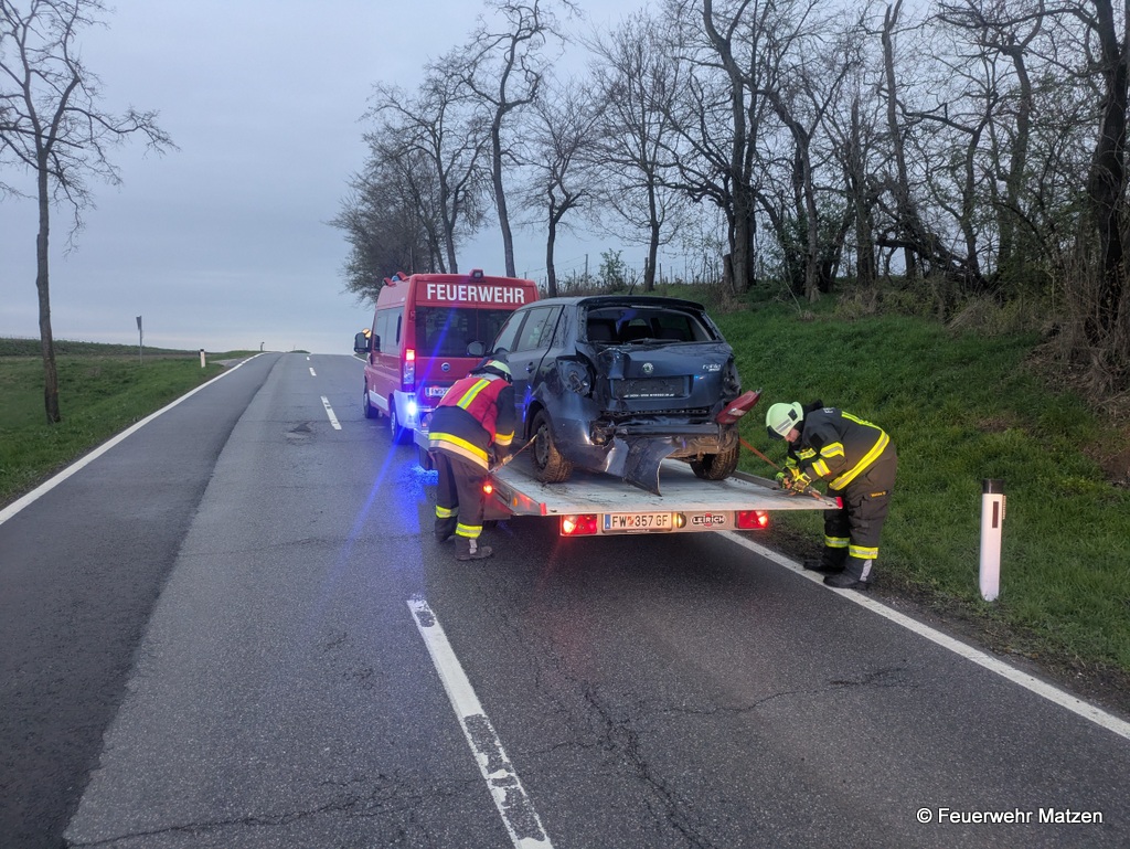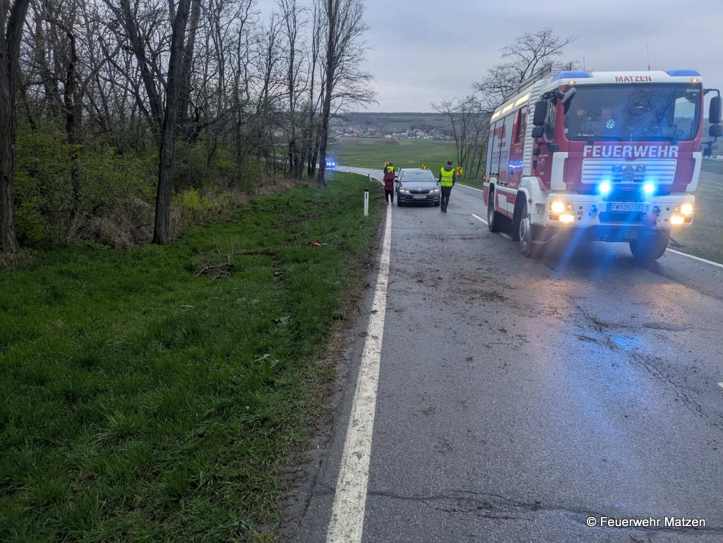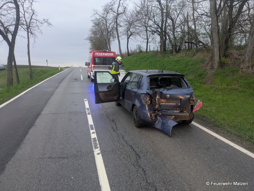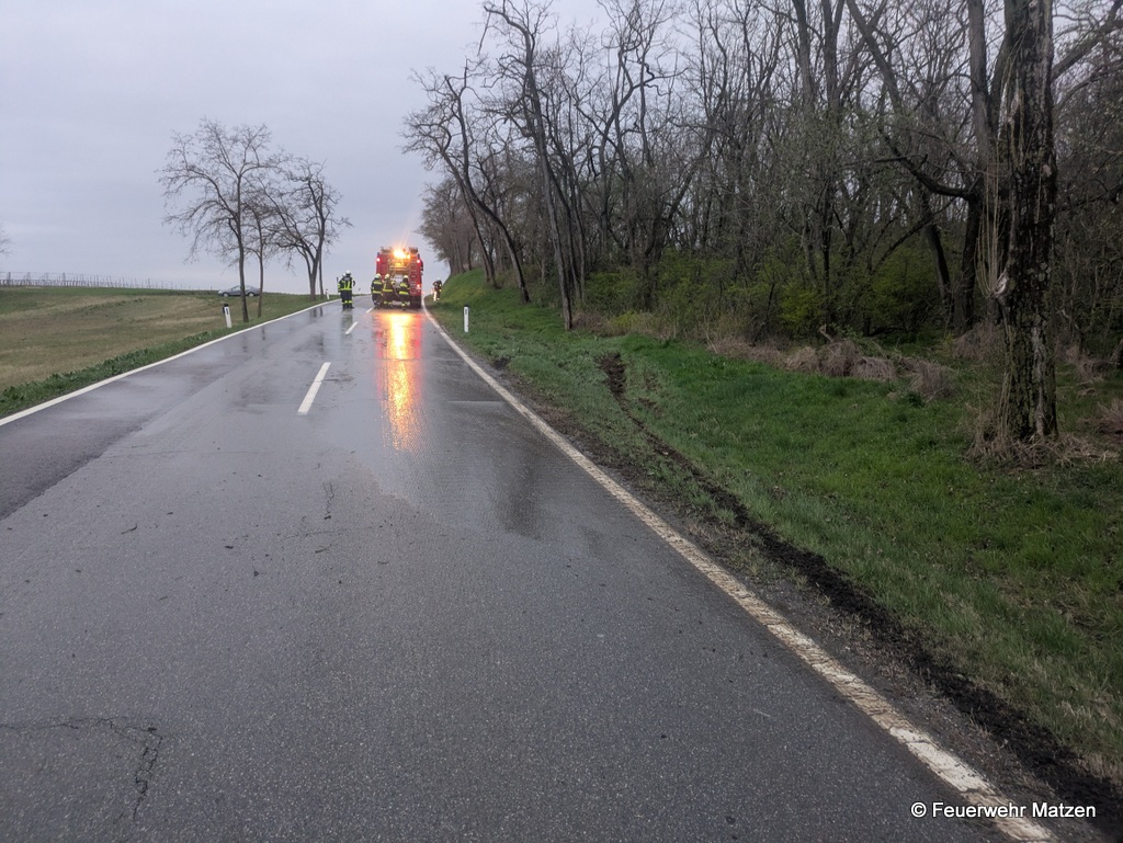 Am Einsatzort angekommen, bot sich folgende Lage: Ein PKW war aus unbekannter Ursache von Matzen kommend auf regennasser Fahrbahn ins Schleudern geraten und krachte schließlich mit dem Heck gegen einen angrenzenden Baum. Glücklicherweise blieb der Fahrer unverletzt.