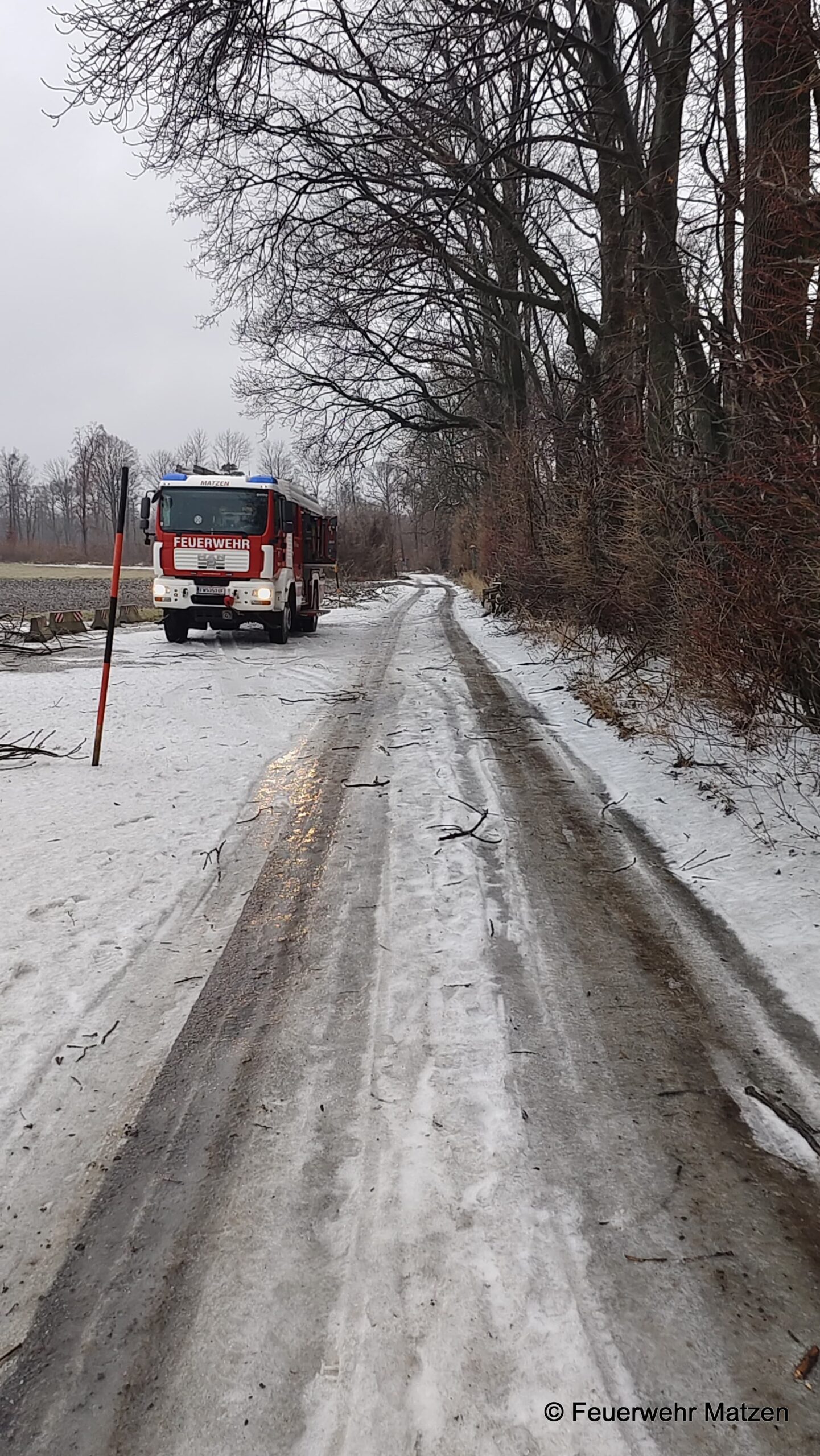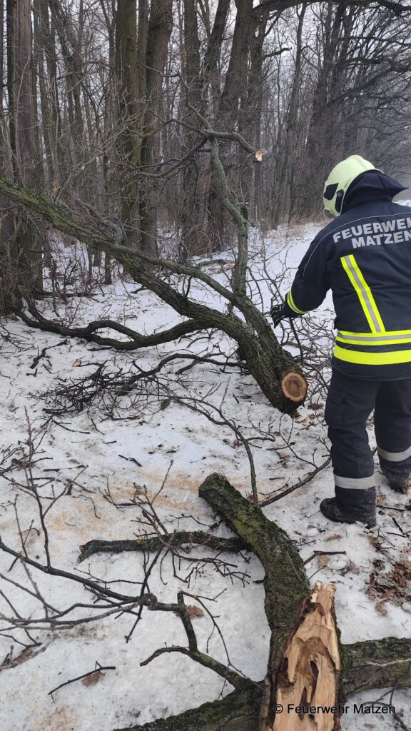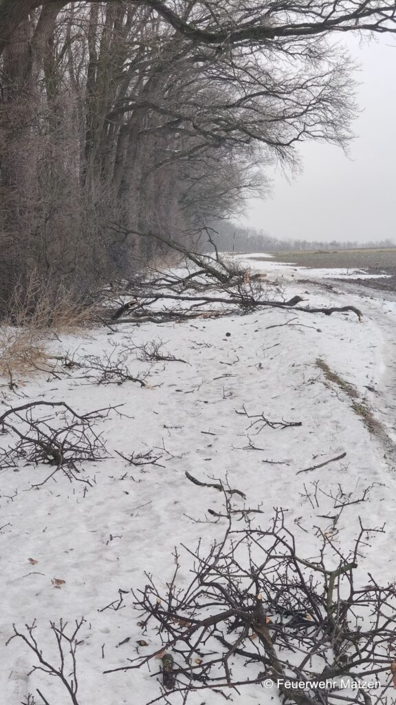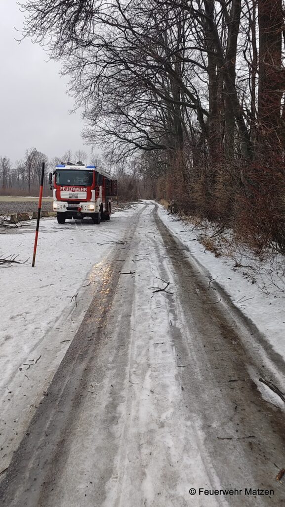 Vor Ort lagen mehrere abgebrochen Äste von klein bis groß auf der Straße verteilt. Diese wurden mittels Kettensäge zerkleinert und von der Straße entfernt. Eisglatte Straßen kamen bei diesem Einsatz als zusätzliche Herausforderung für unsere Einsatzkräfte hinzu.