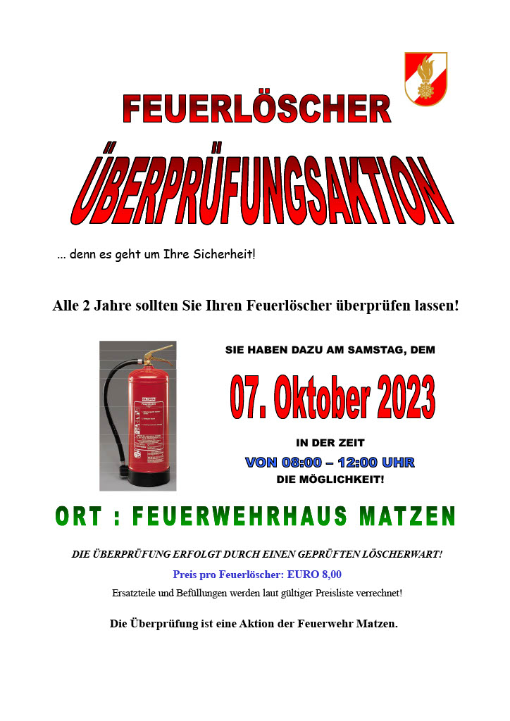 Am Samstag, dem 7. Oktober 2023 haben Sie die Möglichkeit Ihren Feuerlöscher im Feuerwehrhaus Matzen in der Zeit von 8 – 12 Uhr überprüfen zu lassen.
