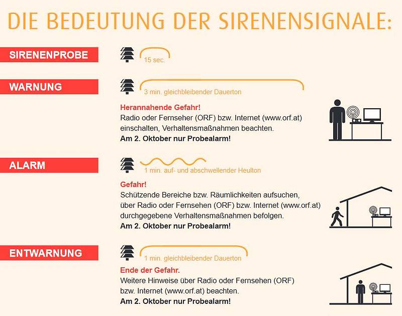 Um 12 Uhr wird wie gewohnt das Signal „Sirenenprobe“ ertönen. Die Sirenen werden 15 Sekunden lang heulen. Um 12.15 Uhr wird dann das Zivilschutzsignal „Warnung“ ausgestrahlt. Dies ist ein dreiminütiger gleichbleibender Dauerton, und bedeutet „Gefahrensituation“. Um 12.30 Uhr wird ein auf- und abschwellender Heulton für ca. eine Minute hörbar sein. Dies ist das „Alarm“-Signal und bedeutet, dass eine Gefahr unmittelbar bevorsteht. Um 12.45 Uhr kommt es dann zur Entwarnung. Ein einminütiger Dauerton wird zu hören sein.