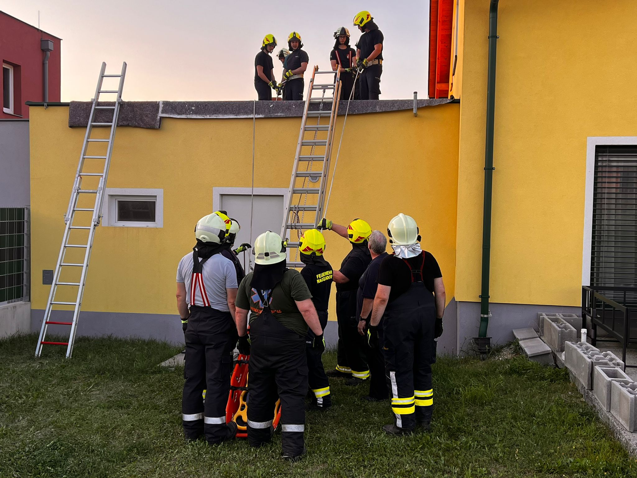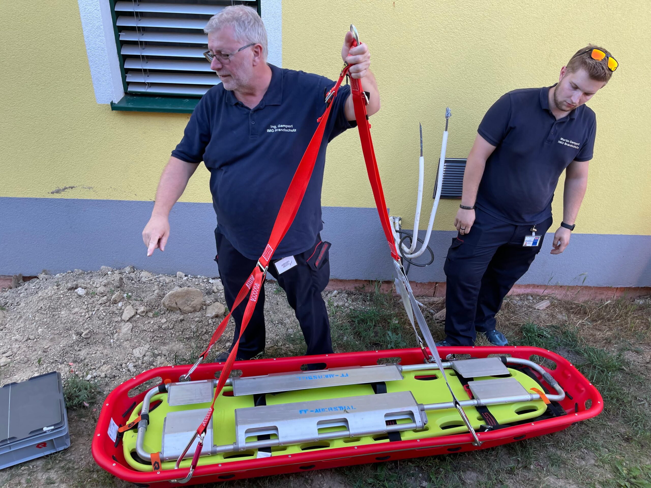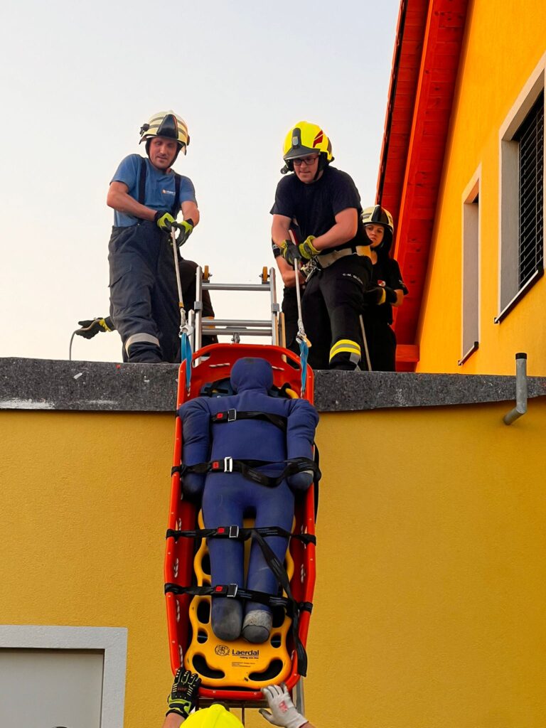 Danach ging es zur dritten Station, wo die Annahme war, dass zunächst eine verletzte Person mittels Korbtrage aus einer ca. 3,5m tiefen Baugrube zu retten ist, um im Anschluss eine verletzte Person von einem Garagendach zu retten, welches denselben Höhenunterschied hat. Hierfür war die FF Raggendorf zur Unterstützung vor Ort, da diese die erforderliche Korbtrage in unserer Großgemeinde vorhält und bei einem Einsatz in Matzen mit dem Meldebild „T2 Menschenrettung – Höhen-/Tiefenrettung“ im Alarmplan ist.