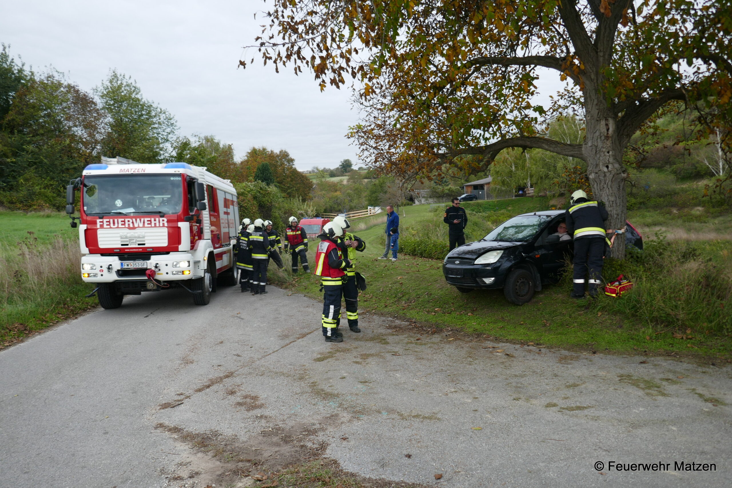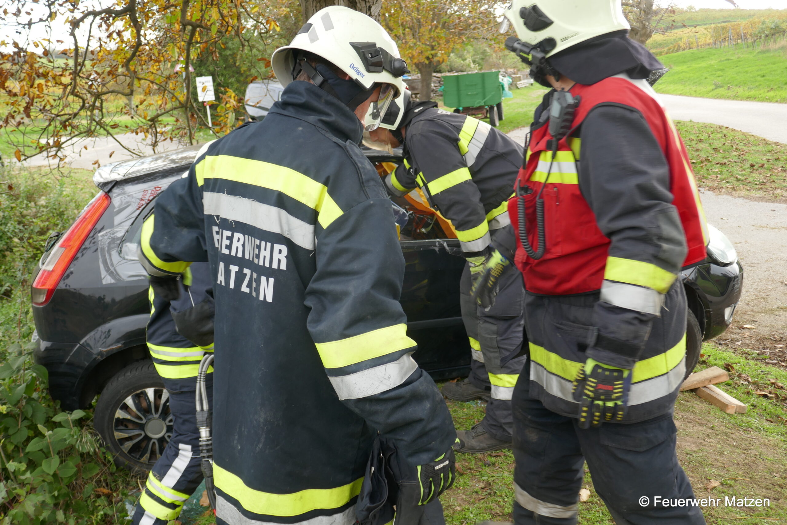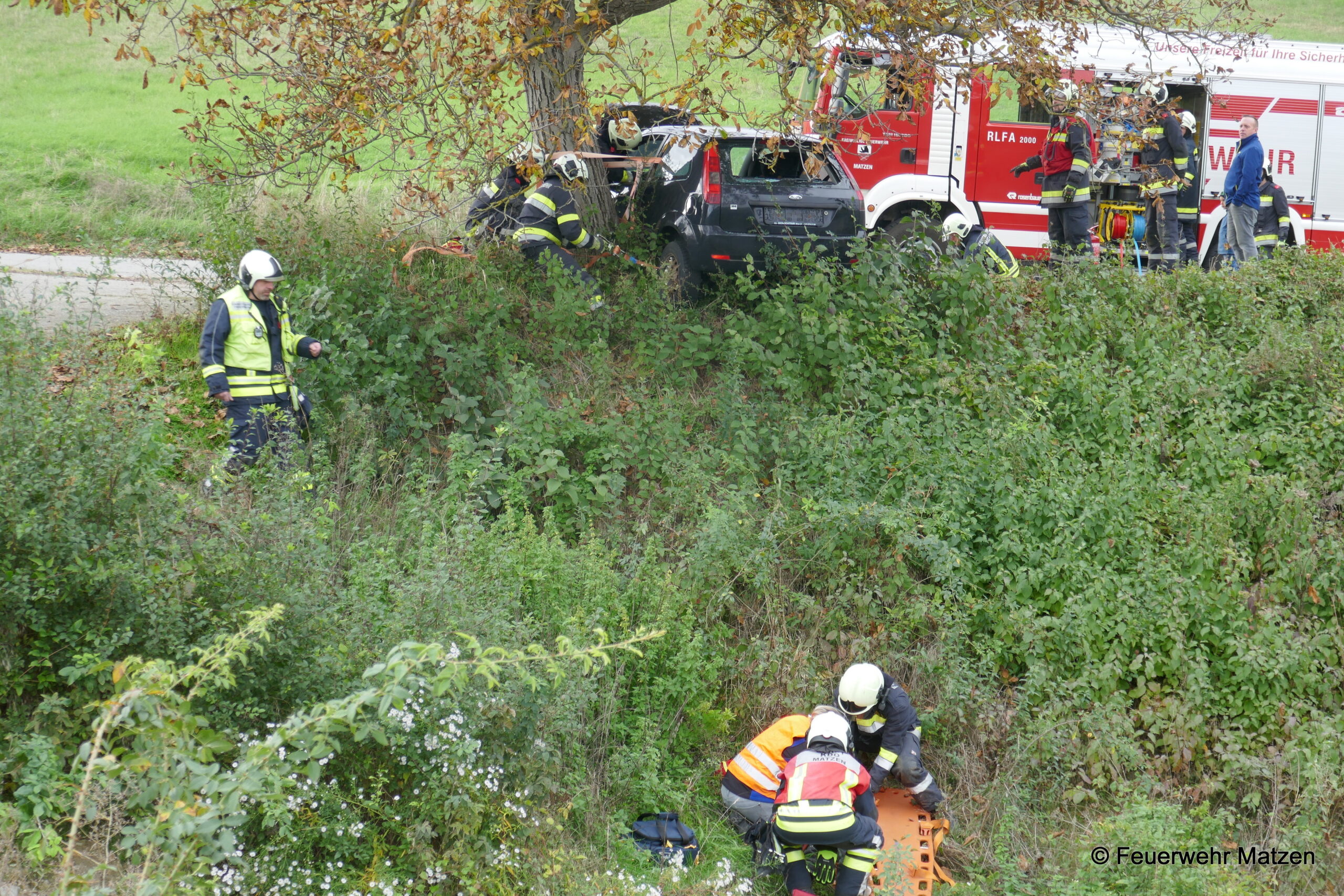 Kurz darauf machten wir uns mit dem RLF und dem KDO auf den Weg Richtung Unfalladresse. Dort angekommen stellte sich folgendes Szenario nach der Erkundung dar. Eine Fahrzeuglenkerin verlor die Kontrolle über ihr Fahrzeug und krachte seitlich gegen einen Baum. Ein Kind wurde beim Aufprall aus dem Fahrzeug geschleudert und im angrenzenden Auffangbecken gefunden.
