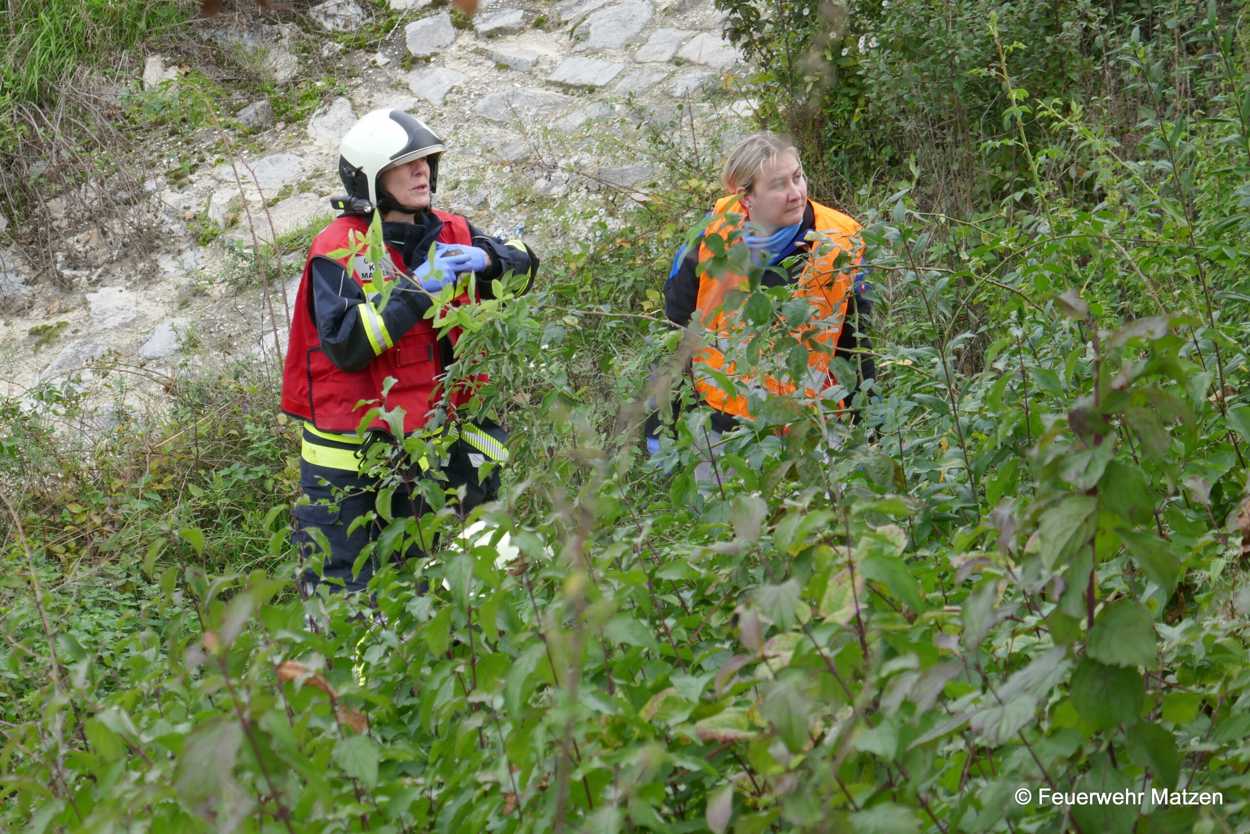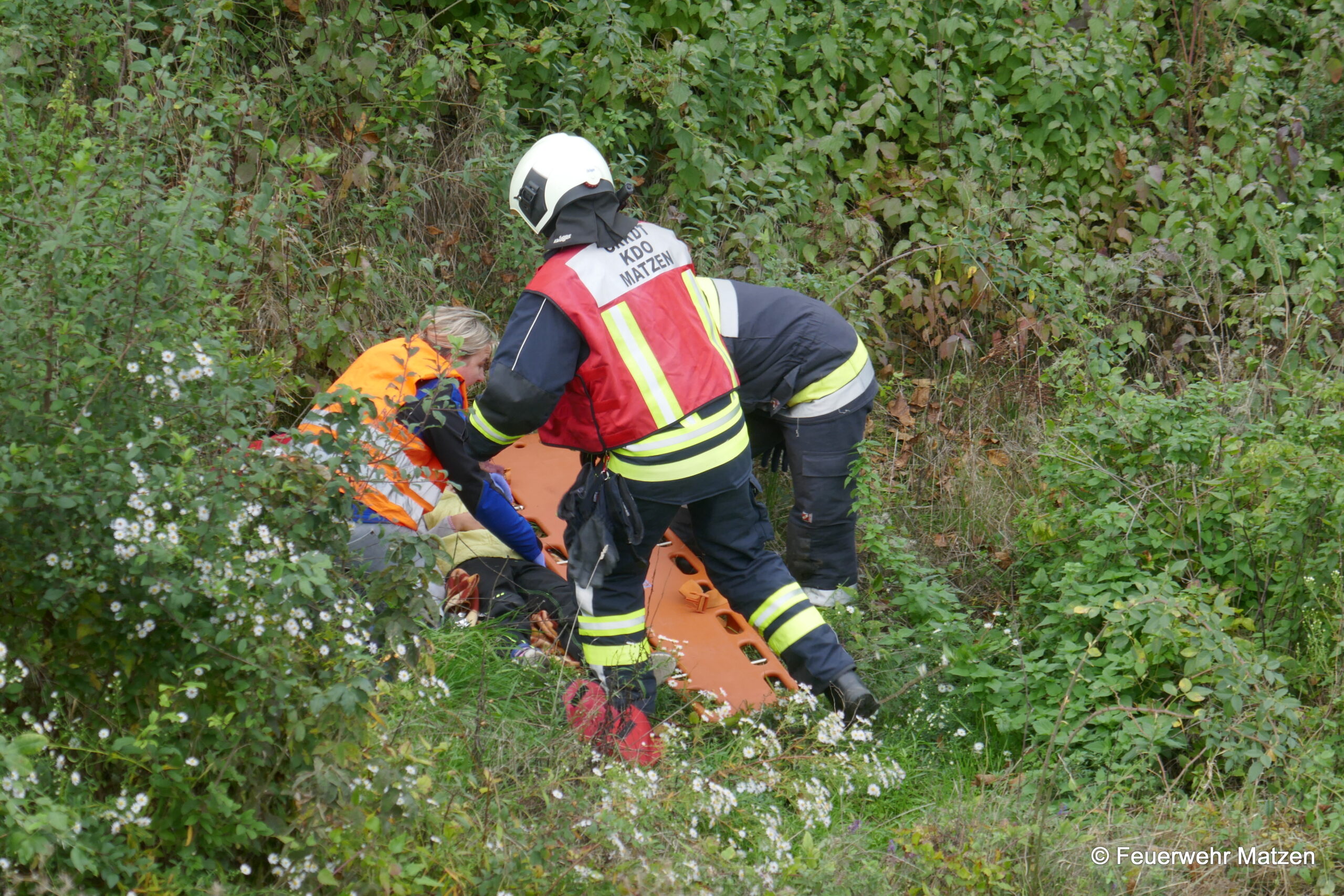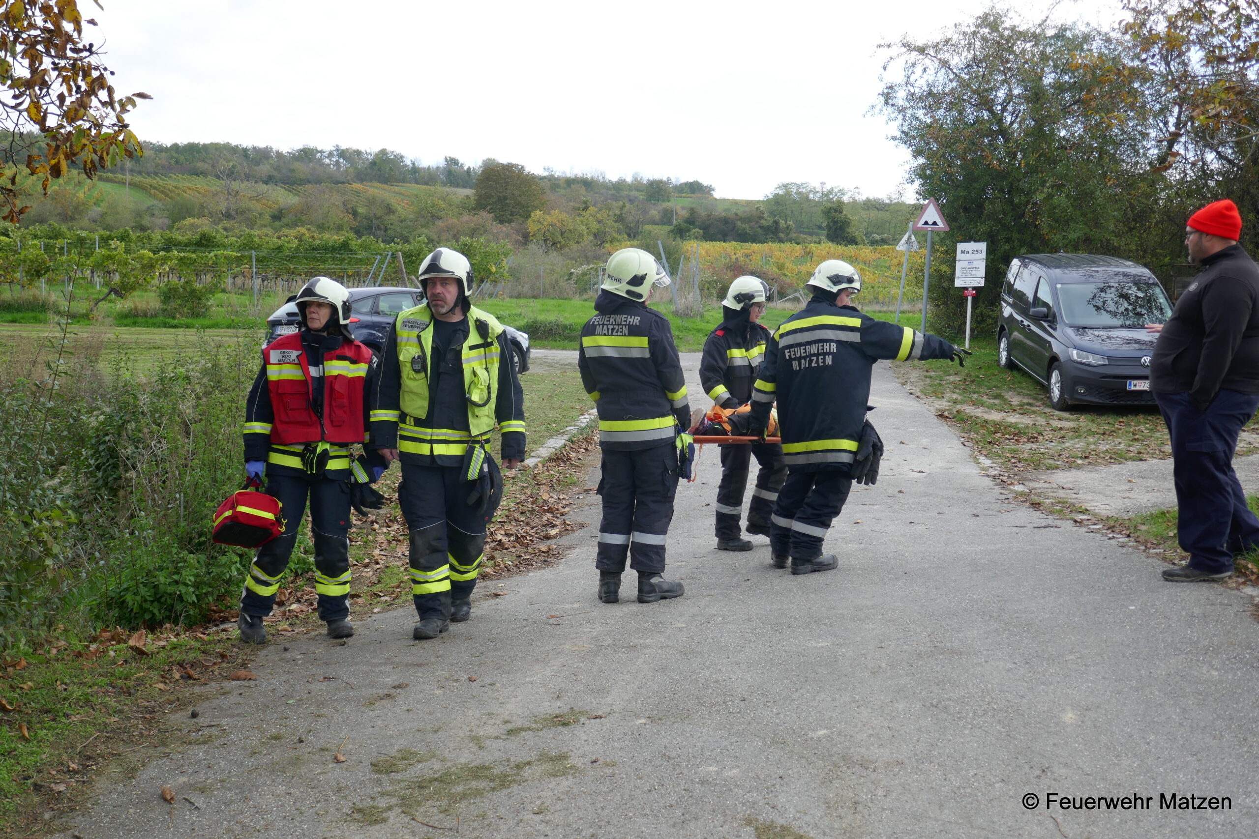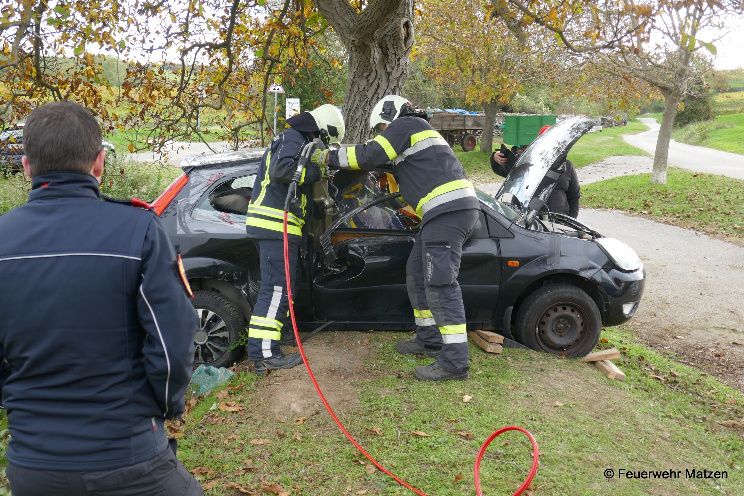 Kurz darauf machten wir uns mit dem RLF und dem KDO auf den Weg Richtung Unfalladresse. Dort angekommen stellte sich folgendes Szenario nach der Erkundung dar. Eine Fahrzeuglenkerin verlor die Kontrolle über ihr Fahrzeug und krachte seitlich gegen einen Baum. Ein Kind wurde beim Aufprall aus dem Fahrzeug geschleudert und im angrenzenden Auffangbecken gefunden.