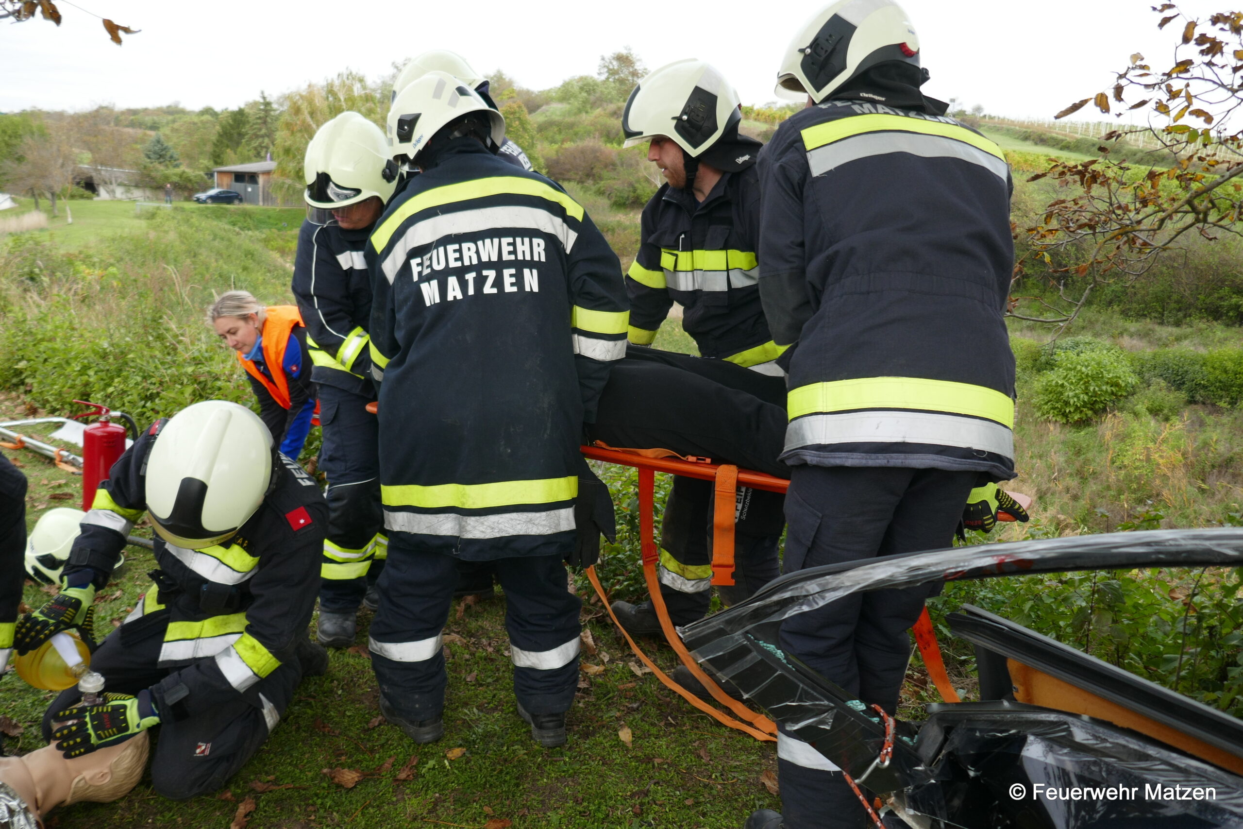 Nach kurzer Zeit konnte die Person aus dem Fahrzeug befreit werden und fiktiv dem Roten Kreuz übergeben werden. Während dieser Arbeiten wurde ein Medizinischer Notfall bei einem Feuerwehrkameraden simuliert. Auch diese Aufgabe konnte bravourös gemeistert werden.