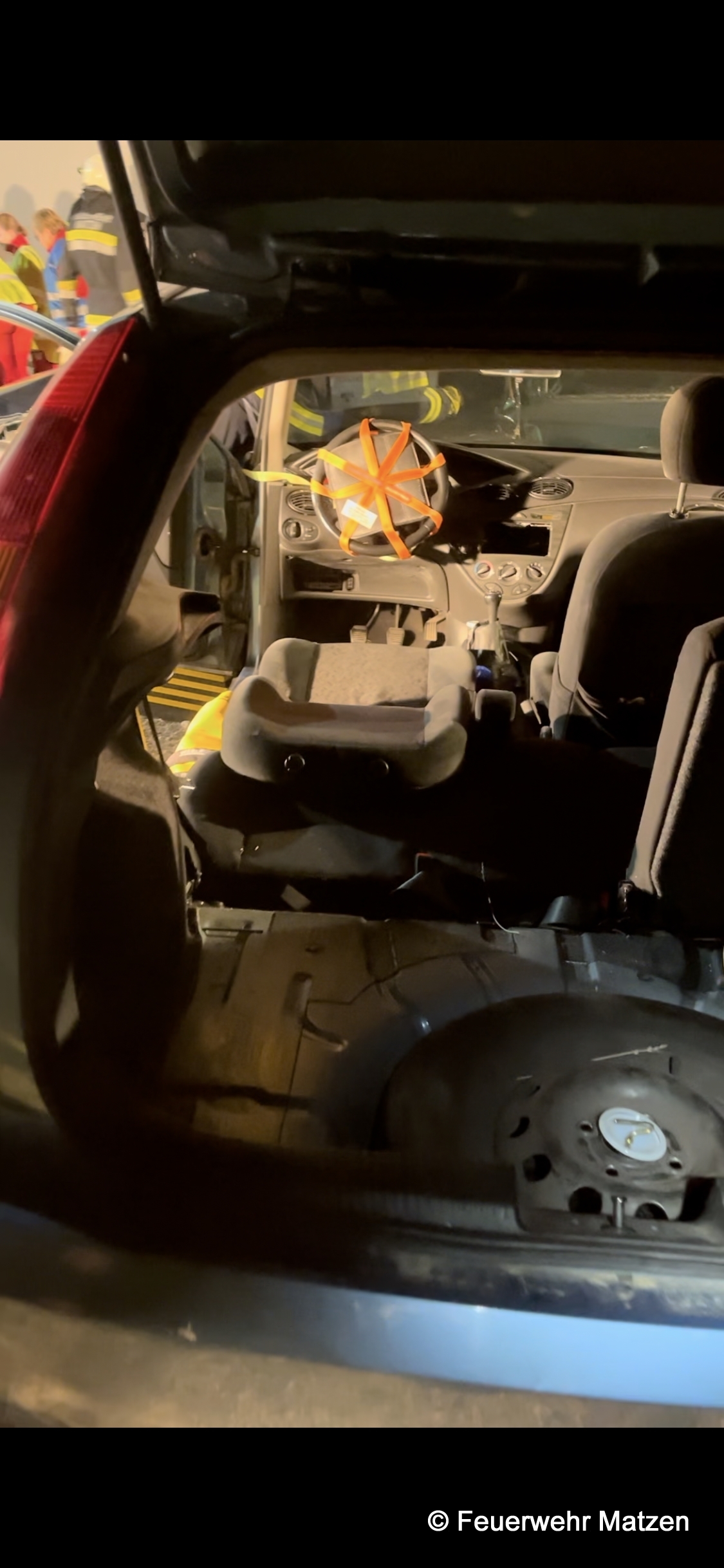 Unserem Gruppenkommandant wurde vom Einsatzleiter die Menschenrettung des Fahrers im zweiten Fahrzeug befohlen. Nach kurzer Mannschaftseinteilung wurde das Fahrzeug abgesichert, ein doppelter Brandschutz aufgebaut und die für die Menschenrettung benötigte Geräte vorbereitet. Zunächst beschloss sich unser Gruppenkommandant für eine große Seitenöffnung um genügend Zugang zur Patientin zu erlangen. Nachdem Fahrerseitig alle Fensterscheiben entfernt wurden wurde mit einer Säbelsäge die B-Säule des Fahrzeuges komplett entfernt. Nach Absprache mit dem Einsatzleiter des Roten Kreuz wurde weiters beschlossen die Patientin aufgrund ihrer Verletzungen zu „Tunneln“. Das bedeutet das die Patientin achsgerecht aus dem Kofferraum gerettet wird. Nachdem die Rücksitze entfernt wurden konnte mittels Spineboard mit der Rettung der Verletzten begonnen werden.