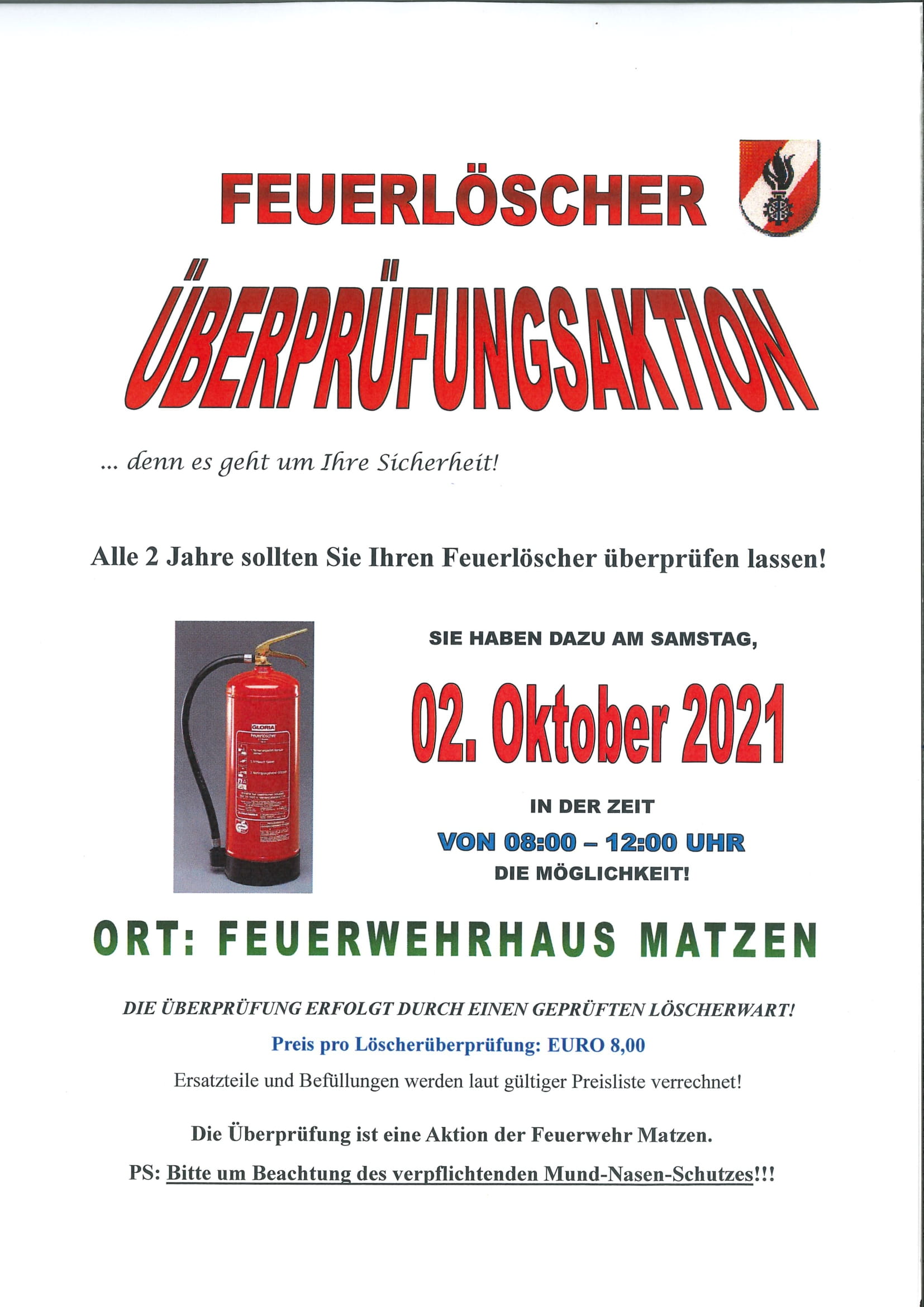 Die Feuerwehr Matzen hat es sich, für Sie – liebe Matznerinnen und Matzner – zur Aufgabe gemacht, diese Überprüfung zu organisieren. Ein jeder kann somit seine Feuerlöscher ins Feuerwehrhaus bringen und die Wartung durchführen lassen.