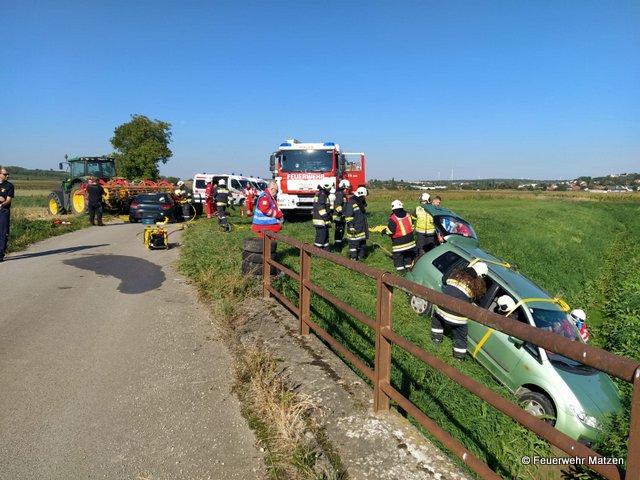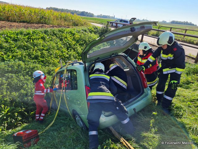 Unverzüglich rückten das RLF 2000 samt Kommandofahrzeug der Freiwilligen Feuerwehr mit insgesamt 17 Mann Besatzung zur Unfallstelle aus. Bei der Erkundung der Lage wurde festgestellt, dass zusätzlich zu den 2 verunfallten Personen noch eine Person im Unfallfahrzeug eingeklemmt war.