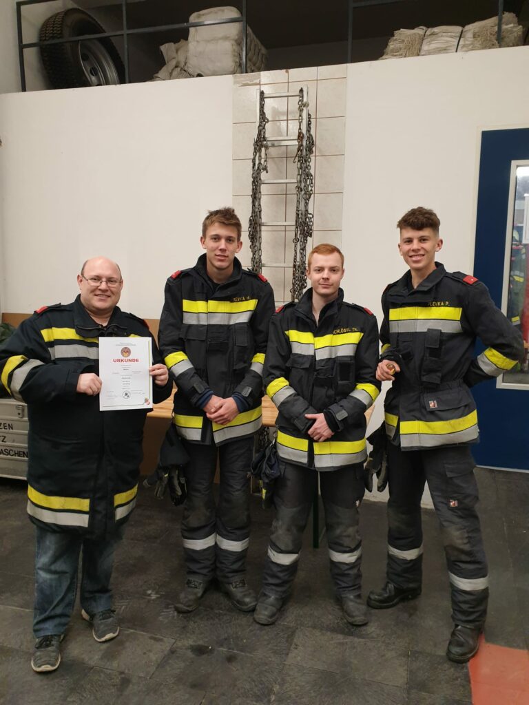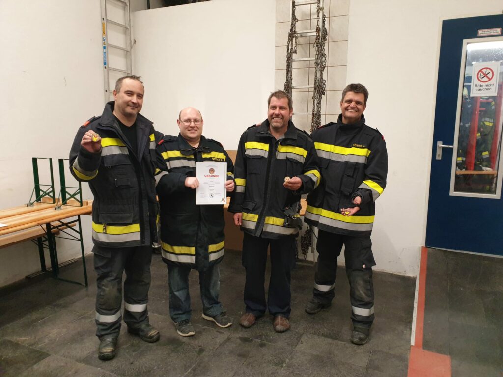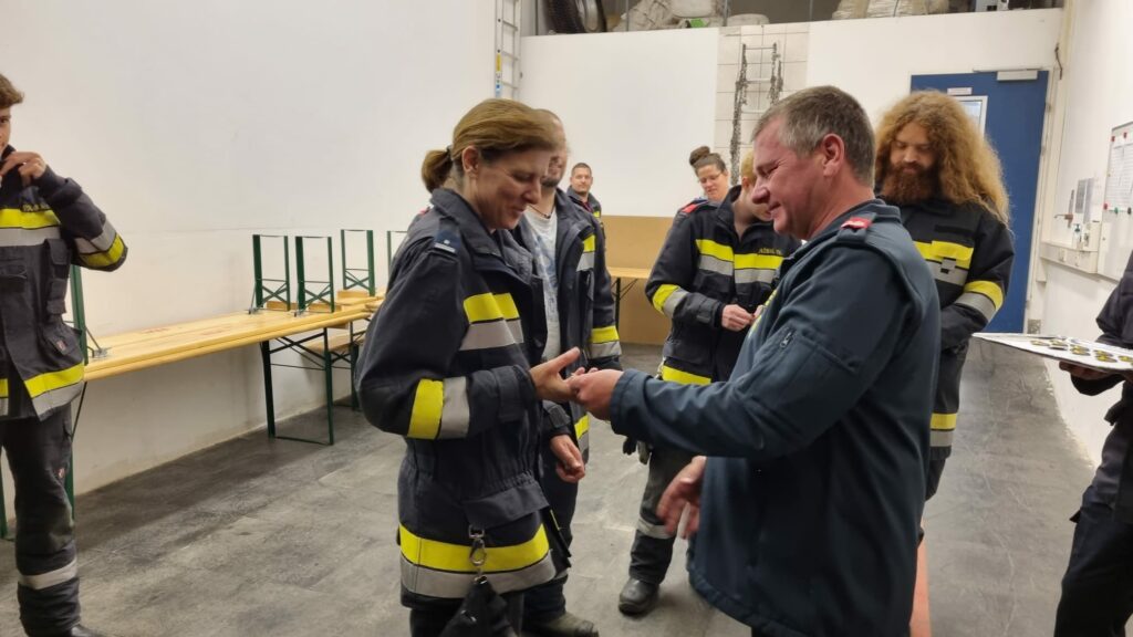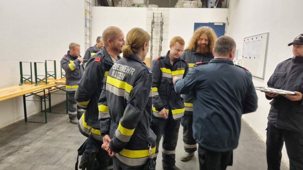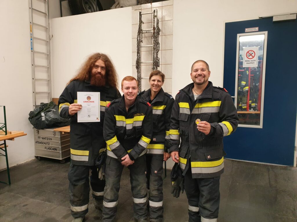 Insgesamt vier Trupps der FF Matzen traten in Bronze zur Prüfung an und zeigten teilweise tolle Leistungen. Die Ausbildungsprüfung erfolgt in 4 Stationen, die in vorgegebener Zeit absolviert werden müssen. Zu Beginn muss sich der Atemschutztrupp nach den Vorgaben der APAS ausrüsten. Danach führt ihn der Gruppenkommandant zur Station „Personensuche“, wo es gilt eine „Person“ in einem verrauchten Raum aufzufinden und sie aus dem Gefahrenbereich zu bringen, sowie dort befindliche Gefahrenquellen auszukundschaften. Darauf folgt ein Löschangriff über eine Hindernisstrecke. Der Trupp hat hierbei eine Löschleitung (ab Verteiler) zu errichten und mit dieser drei Hindernisse zu bewältigen. Zuletzt müssen die Atemschutzgeräte noch richtig versorgt werden. Währenddessen werden dem Gruppenkommandanten vom Hauptprüfer Fragen aus dem Gebiet Atemschutz gestellt. In der Stufe Bronze stehen die Positionen der vier Truppmitglieder schon fest.