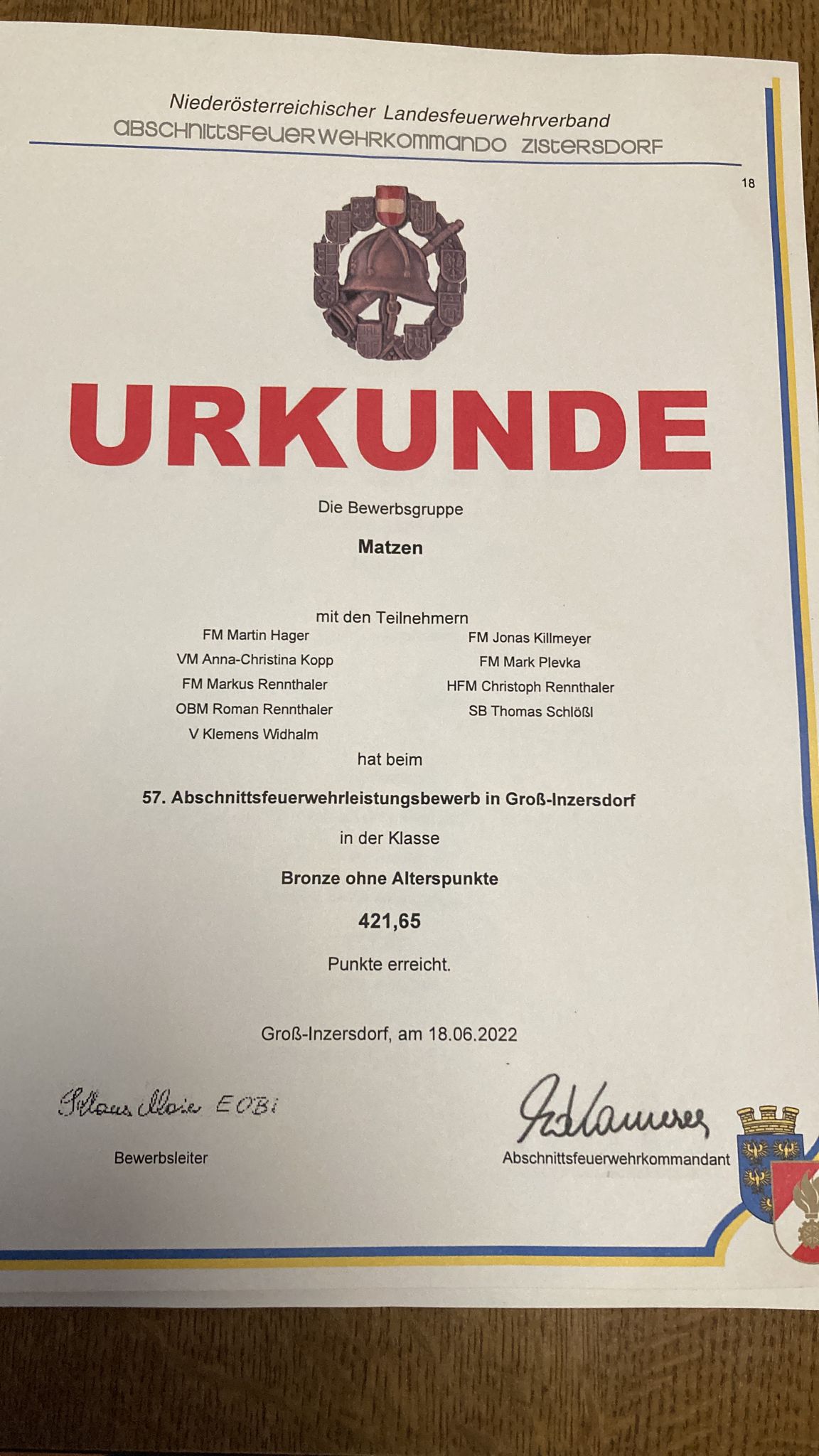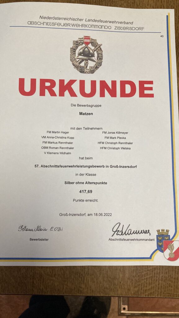 Wie erfolgreich diese Vorbereitung ist, kann man an den Ergebnissen unserer FF Matzen bei den 57. Abschnittsleistungsfeuerwehrleistungsbewerben des Abschnittes Zistersdorf, die am 18. Juni 2022 in Groß-Inzersdorf stattgefunden haben, erkennen.
