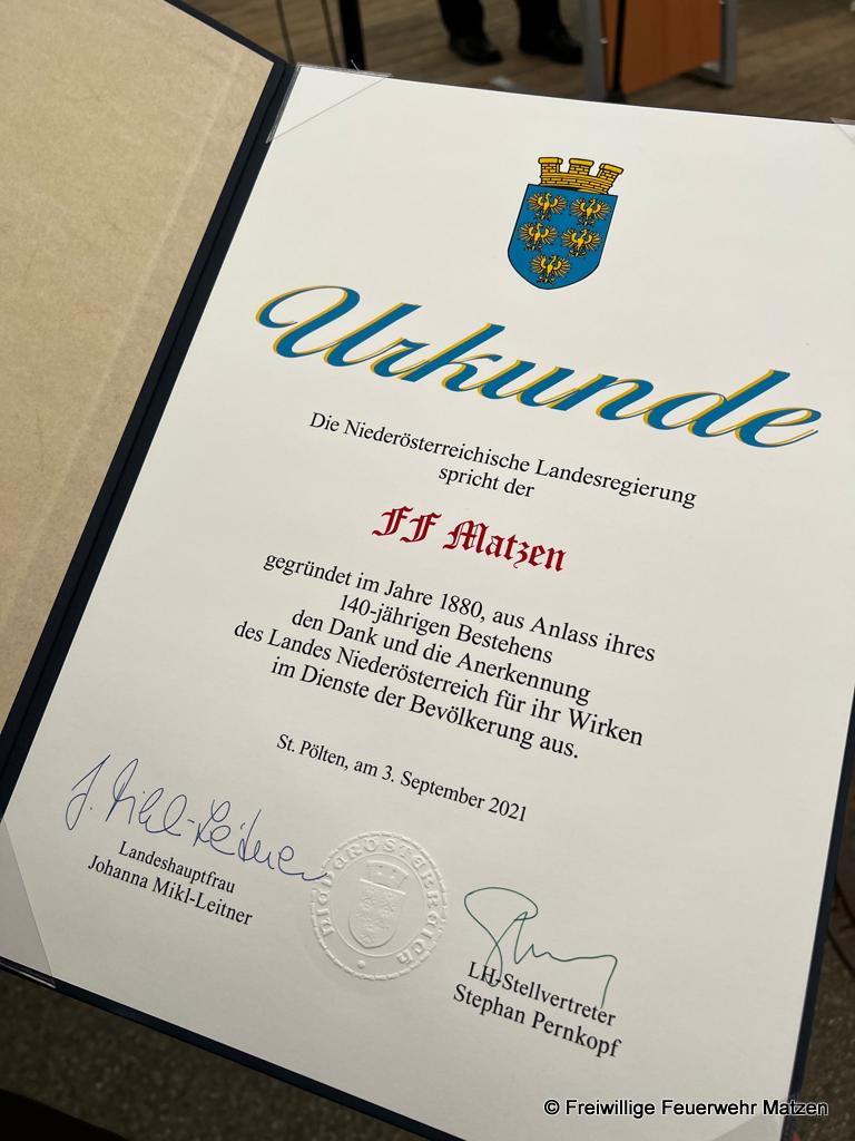 - Urkunde für das 140-jährige Bestandsjubiläum für die FF Matzen