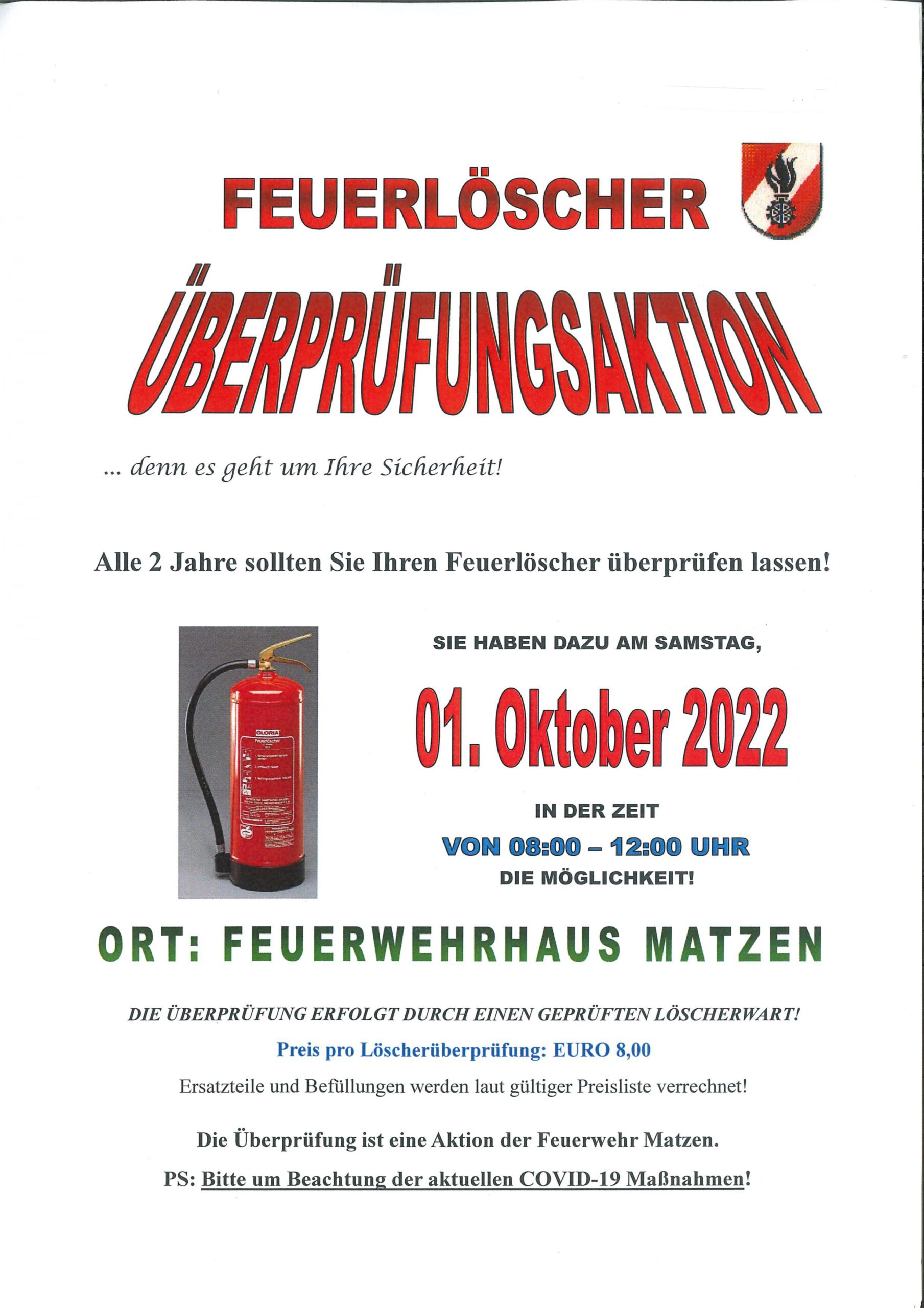 FF Matzen – Feuerlöscher Überprüfungsaktion am 1. Oktober 2022 (08.00 – 12.00 Uhr) im Feuerwehrhaus Matzen