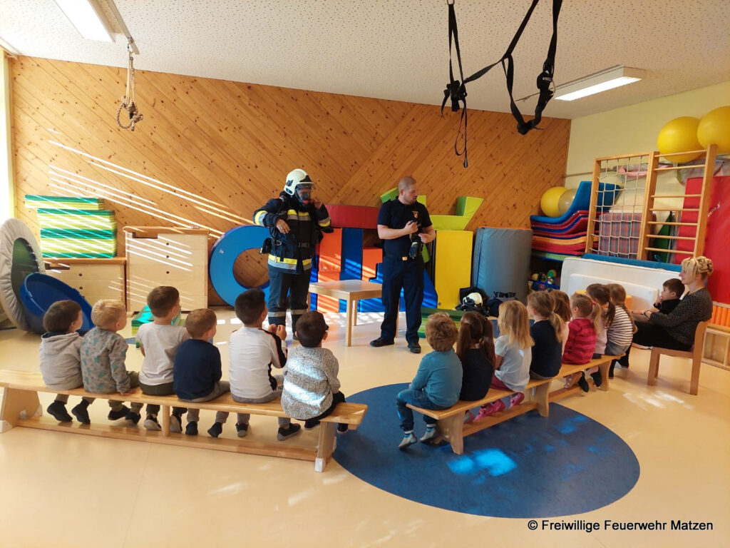 Durch den Besuch der Feuerwehr Matzen im Kindergarten und in den Schulen lernen die Kinder die Uniform kennen. Sie sehen die Ausrüstung, können sie anfassen und hören die Atemgeräusche des Feuerwehrmannes unter der Atemschutzmaske. Sie lernen, dass sich die Stimme eines Feuerwehrmannes unter Atemschutz ganz anders anhört als gewohnt und sie erfahren, warum die Feuerwehr eventuell mit schwerem Werkzeug und sogar auf den Knien zu ihnen kommt.