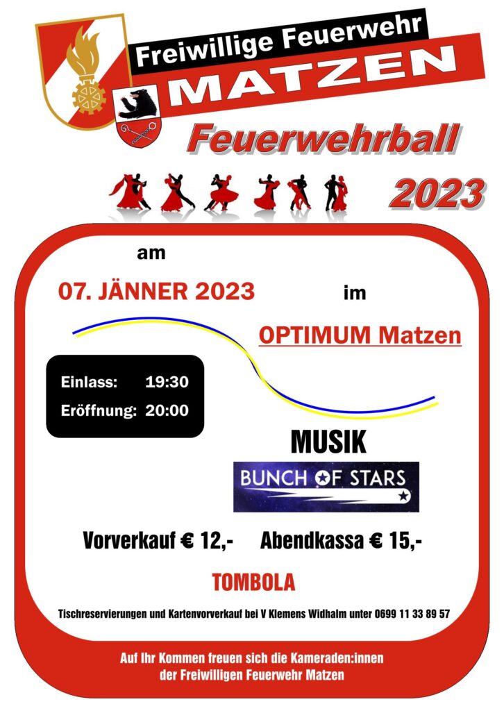 Die Kameradinnen und Kameraden der Freiwilligen Feuerwehr Matzen laden herzlich zum traditionellen Feuerwehrball am Samstag 7. Jänner 2023 ab 19.30 Uhr in das Optimum Matzen ein. Geselliges Beieinandersein, schwungvolle Live Musik mit „Bunch Of Stars“, eine Verlosung mit zahlreichen tollen Preisen und unser Barbetrieb begleiten die Besucher bis in die späte Nacht. Wir freuen uns auf Ihr Kommen!