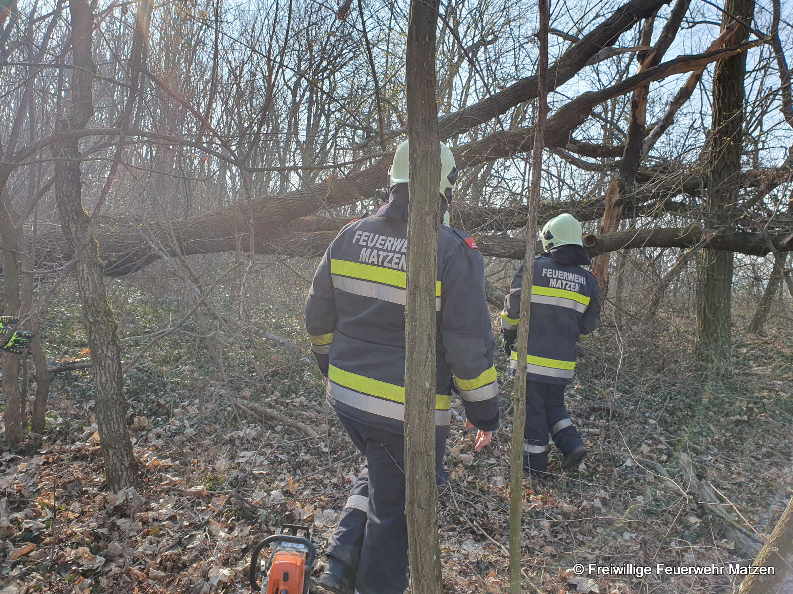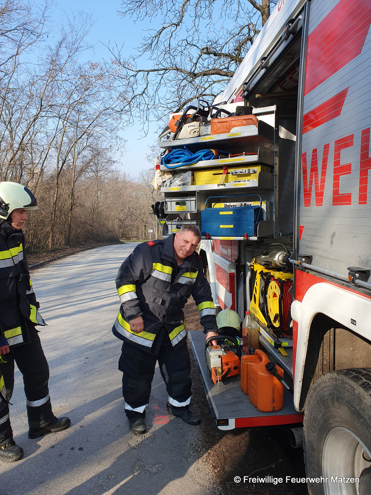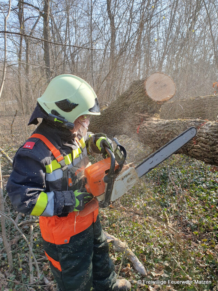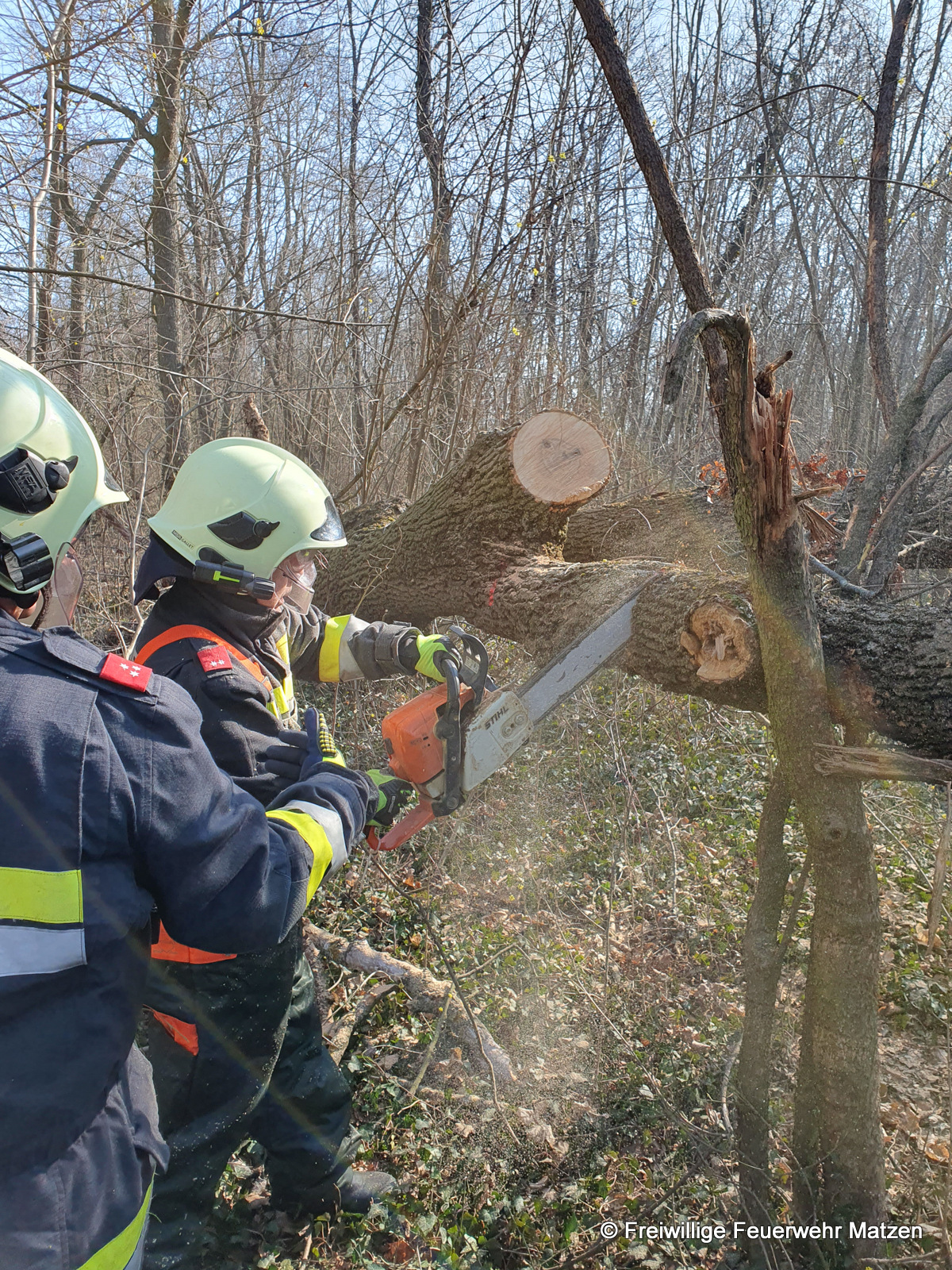 Am Samstag, dem 4. März 2023 fand für unsere Freiwillige Feuerwehr Matzen deshalb eine Sonderübung zum korrekten Umgang mit Kettensägen statt. Sechs Kollegen fanden sich zu dieser Übung ein, um ihr Wissen aufzufrischen. Ein extra ausgewählter, aufgrund eines Stumrmes bereits umgestürzter Baum im Matzner Wald stand zur Verfügung, an dem die Handhabung der Säge geübt werden konnte und die korrekten Handgriffe gezeigt wurden, um einen Baum fachgerecht zu fällen. Neben der Grundausbildung an der Säge ist vor allem die Praxis beim Umschneiden entscheidend, um Unfälle zu vermeiden.