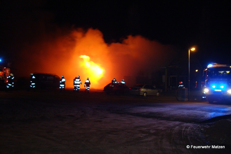 Am 30.12. 2012 heulten in 7 Gemeinden rund um Matzen die Sirenen. Die Feuerwehr Matzen wurde um 17:30 mittels Totalalarm zu einem Brand bei der Firma Marco Moto alarmiert. Weiters wurden die Feuerwehren Raggendorf, Prottes und Groß Schweinbarth gleichzeitig alarmiert. Unverzüglich rückten 17 Mann der örtlichen Feuerwehr mit 2 Fahrzeugen zum Einsatzort aus.
