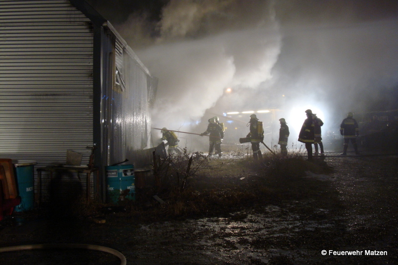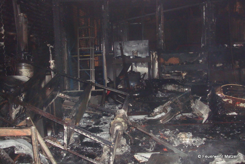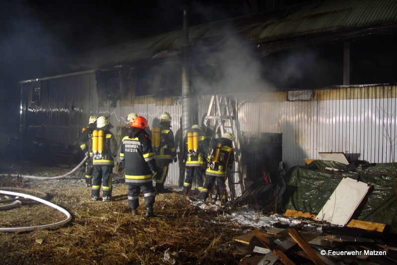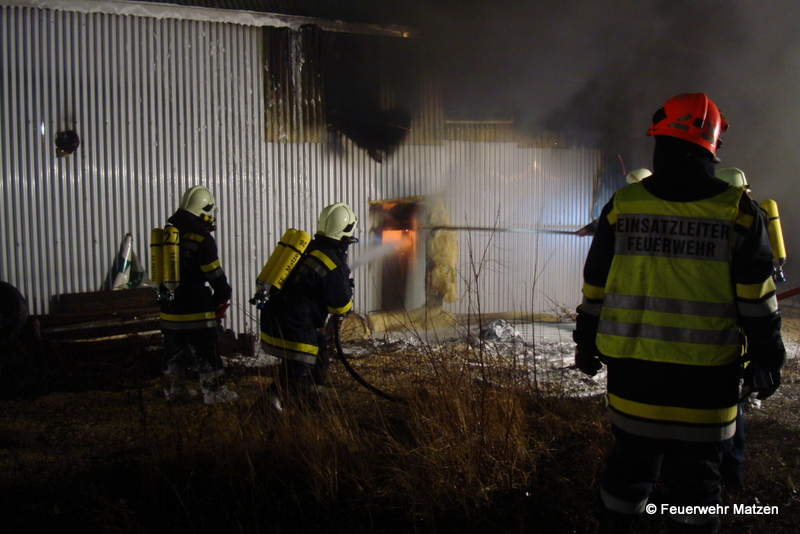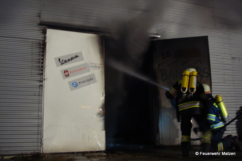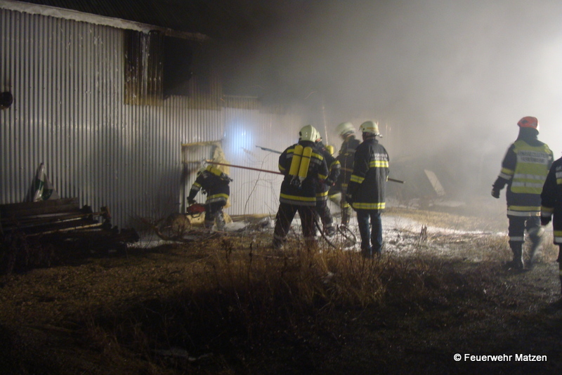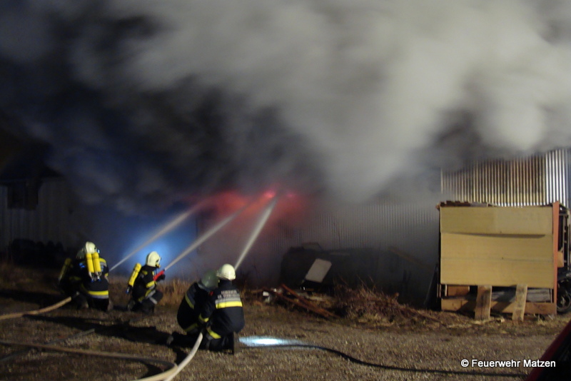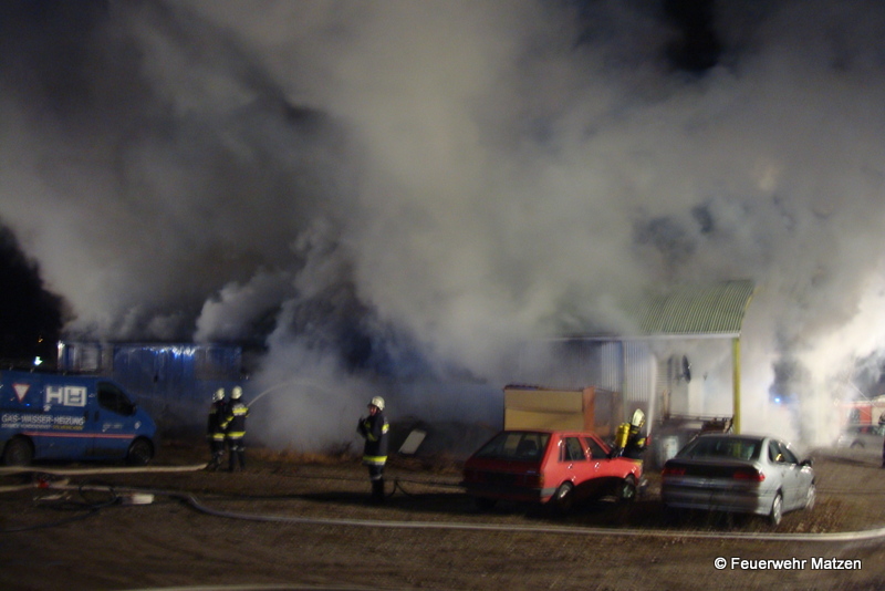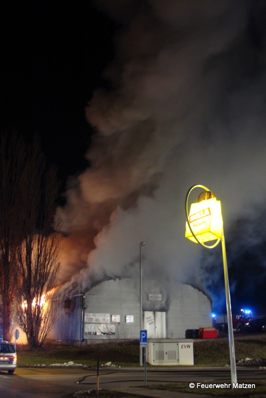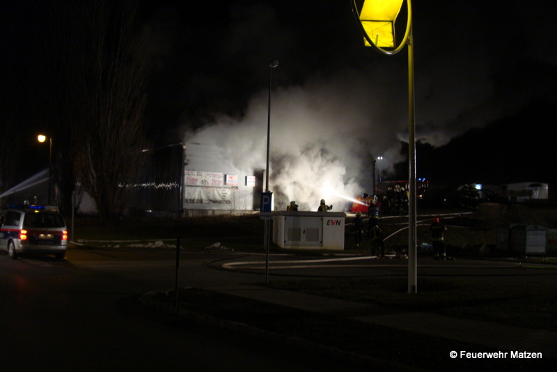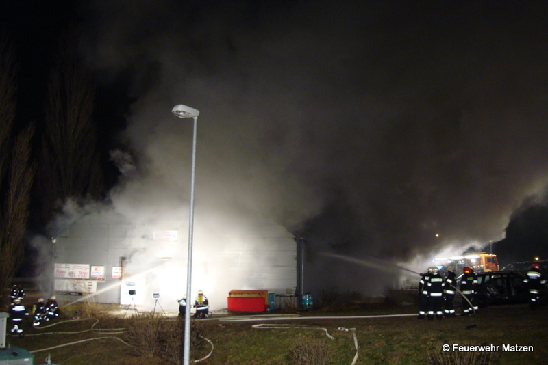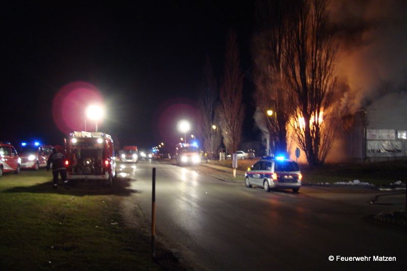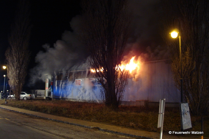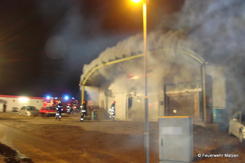 An der Einsatzstelle angekommen erkundete der Einsatzleiter HBI Neubauer Manfred die Lage und teilte die bereits eingetroffenen Feuerwehren ein. Glücklicherweise befanden sich keine Personen im Gebäude. Aufgrund der thermischen Belastung der Dachkonstruktion konnte kein Innenangriff vorgenommen werden, deshalb wurde ein umfassender Außenangriff befohlen. Es wurde die Wasserversorgung von drei Hydranten hergestellt und mit der Brandbekämpfung unter Atemschutz mittels C und B-Strahlrohren begonnen. Da die im hinteren Bereich befindliche Werkstatt noch nicht in Brand geraten war, wurde diese mit einigen Rohren geschützt. Inzwischen wurde von der FF Matzen die Einsatzleitung und von der FF Groß Schweinbarth der Atemschutzsammelplatz aufgebaut. Während den Kühlversuchen im hinteren Bereich wurden Gas und Acetylenflaschen gesichtet und in Folge in Sicherheit gebracht. Da aufgrund der Konstruktion der Halle die direkte Bekämpfung des Brandherdes nicht möglich war, wurde von der Feuerwehr Matzen eine Öffnung in der Seitenwand mittels Rettungssäge geschnitten und mittels Schaummittel bekämpft. Wegen der großen Rauchentwicklung wurde der Druckbelüfter in Stellung gebracht um die heissen Brandgase aus der Halle zu bekommen. Aufgrund des großen Atemschutzbedarfs wurden die Feuerwehren Schönkirchen-Reyersdorf, Auersthal und Dörfles nachalarmiert. Um 19:05 wurde vom Einsatzleiter an die Einsatzleitung gemeldet das der Brand unter Kontrolle ist und die ersten Feuerwehren den Einsatzort verlassen können. Bereits 40 Minuten später konnte Brand aus gegeben werden und die restlichen Feuerwehren bis auf Matzen und ein Fahrzeug der Feuerwehr Groß Schweinbarth konnten wieder reinrücken. Während der Brandsicherheitswache wurden noch Spannplatten und Tellwollerollen aus dem Brandobjekt entfernt. Nachdem noch einige kleinere Glutnester abgelöscht wurden konnten die verbliebenen Einsatzkräfte den Einsatzort um 00:10 verlassen. Um ca 1 Uhr wurde die Einsatzbereitschaft wieder hergestellt.