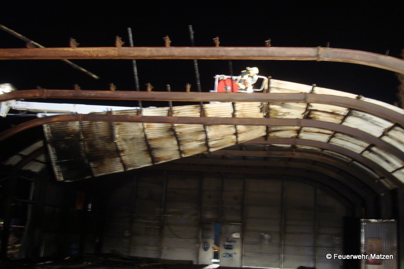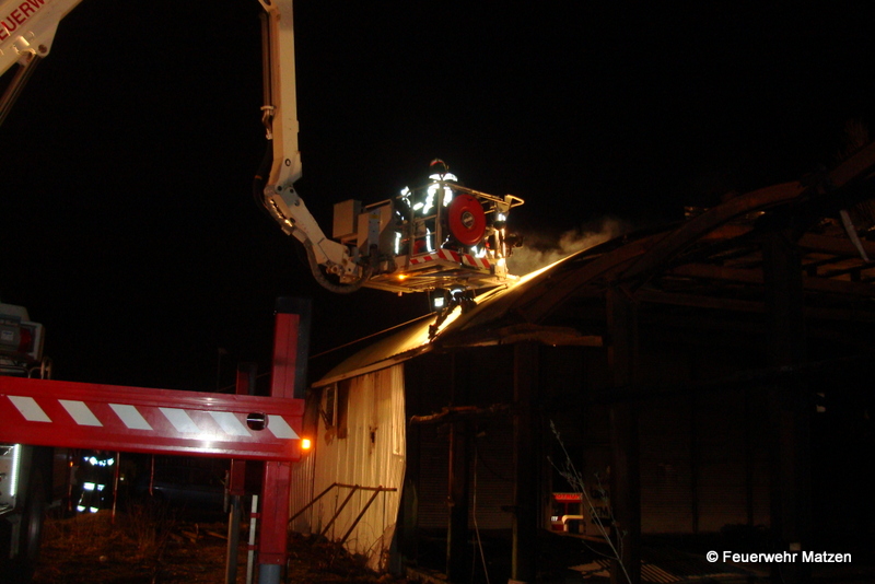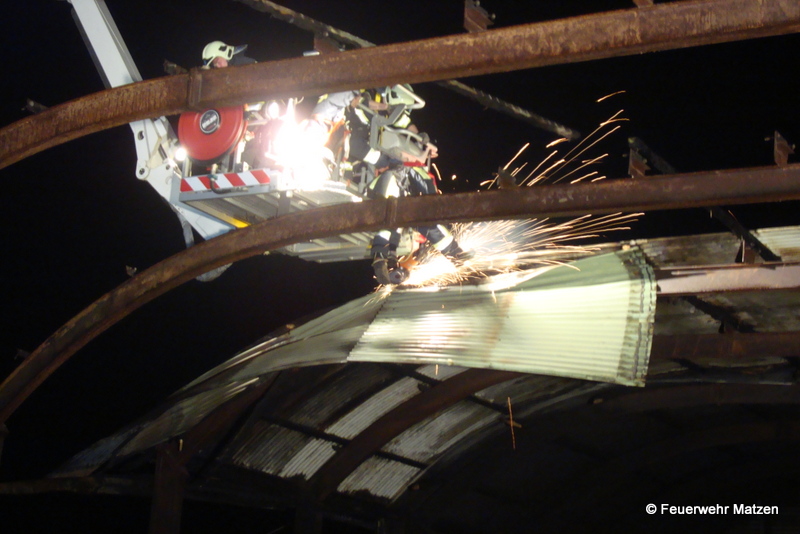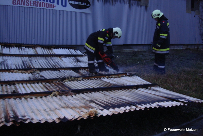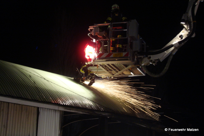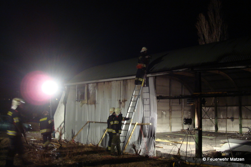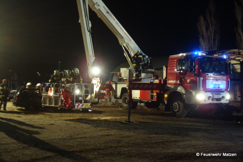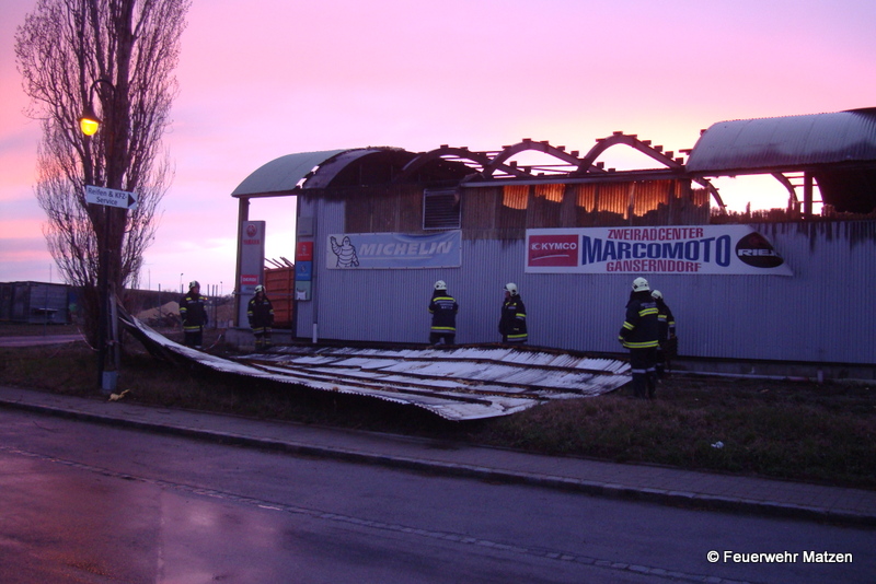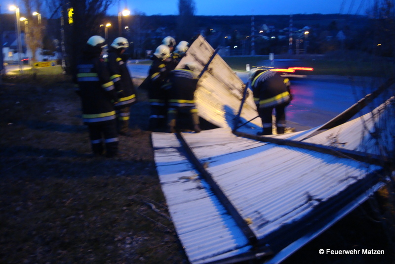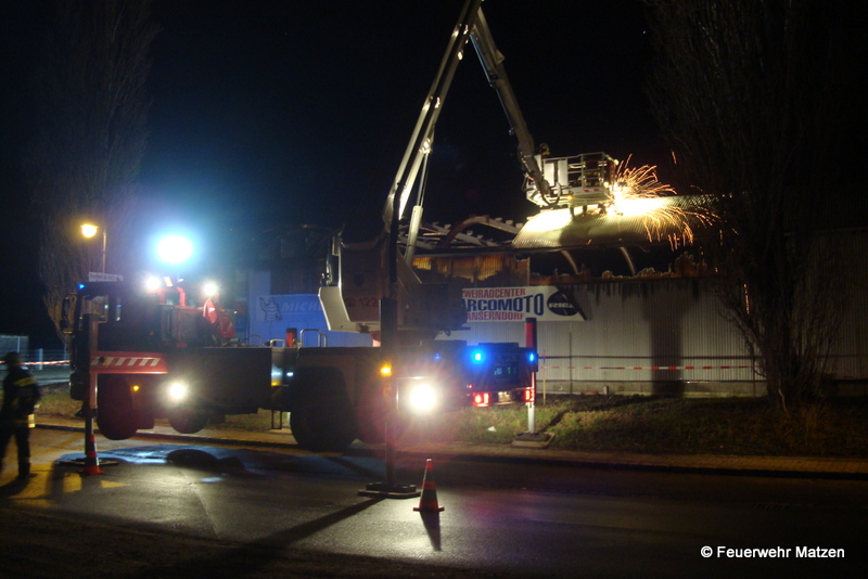 Am 12.04.2013 wurde die Feuerwehr Matzen um 19:24 zu einer Technischen Hilfeleistung bei der Fa. Makromoto alarmiert. Nachdem Start der Abbrucharbeiten der Fa. Makromoto löste sich in den Abendstunden aufgrund von Sturmböen die Dachhaut und stürtzte teilweise auf die angrenzende Landesstraße. Gleichzeitig wurde die Feuerwehr Raggendorf alarmiert. Mit 20 Mann und 3 Fahrzeugen rückten die Matzener Florianijünger zur Einsatzstelle.