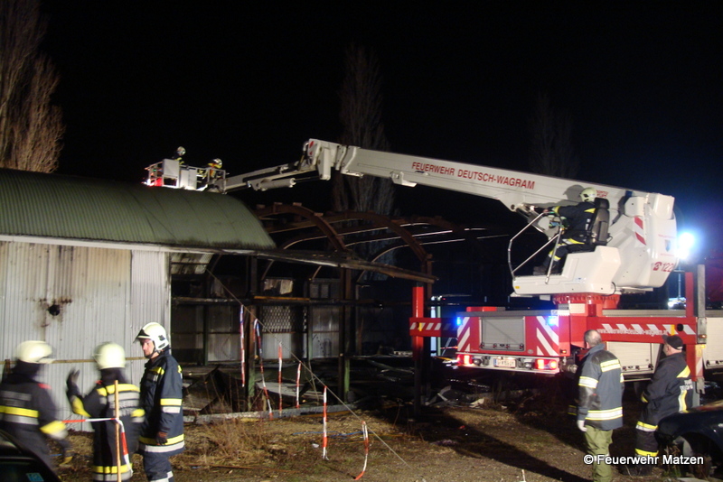 Nach der Erkundung des Einsatzleiters wurde die Teleskopmastbühne der Feuerwehr Deutsch Wagram nachalarmiert. Inzwischen wurde begonnen die abgestürtzten Teile zu zerlegen und von der Straße zu entfernen. Nach dem Eintreffen der Einsatzkräfte aus Deutsch Wagram wurde begonnen die restliche Dachhaut zu entfernen. Nach rund 2 Stunden wurden die beiden letzten Elemente mit Stahlseilen gesichert und die Einsatzkräfte konnten um 22:45 wieder einrücken.