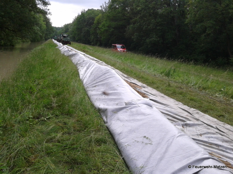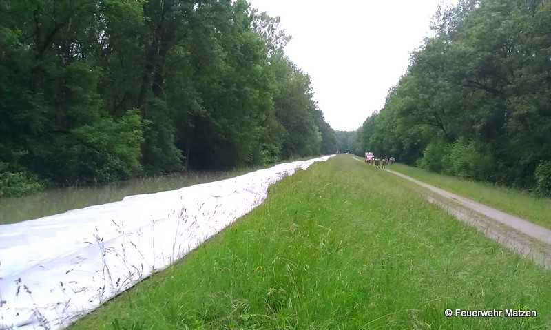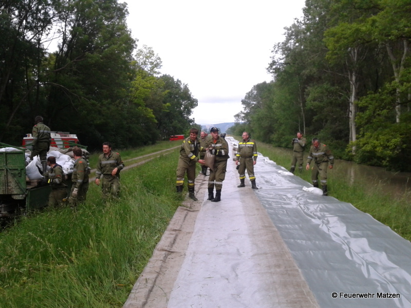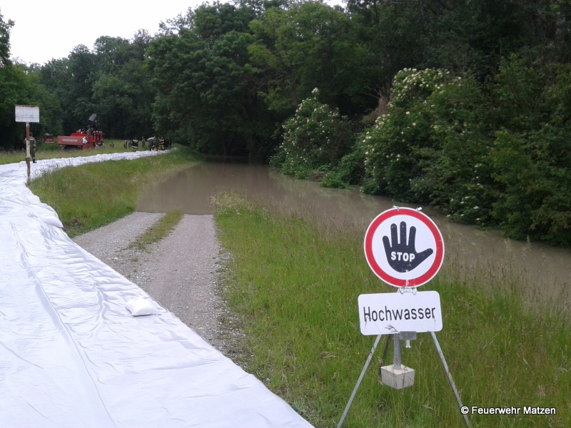 5 Kameraden rückten mit dem Kommandofahrzeug zum Bereitstellungsraum nach Stopfenreuth aus. Nach der Befehlsausgabe an die in diesem Einsatzgebiet eingesetzten Feuerwehren, begaben sich die Einsatzkräfte auf den Damm. Dieser musste aufgrund des steigenden Pegels auf einer Länge von ca 1800 Metern erhöht werden, um einen Anstieg über den Scheitelpunkt des Dammes zu verhindern. Die Last- und Wechselladefahrzeuge aus dem gesamten Bezirk lieferten Folien und Flies die auf der Dammkrone aufgelegt wurden. Für die Erhöhung schütteten eine Vielzahl von Traktoren Sand auf welcher wiederum von den Folien abgedeckt wurde. Abschließend wurden die Folien mit Sandsäcken beschwert. Nach rund 6 Stunden Arbeit am Damm konnten die eingesetzten Feuerwehren wieder abrücken.