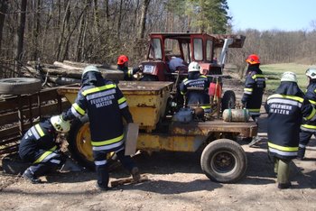 Um 14 Uhr rückte die Feuerwehr Matzen mit 3 Fahrzeugen und 15 Mann zum Einsatzort in den Matzner Wald aus. Bei der Ankunft stellte sich folgende Lage den Einsatzkräfte. Vermutlich bei Verladearbeiten kollidierten ein Traktor mit Anhänger und eine Baumaschine. Durch den Anprall kippte der Anhänger und der Fahrer der Baumaschine wurde auf die Ladefläche katapultiert. Der Fahrer des Traktors saß mit unbestimmten Verletzungen, bewusstlos im Führerhaus.