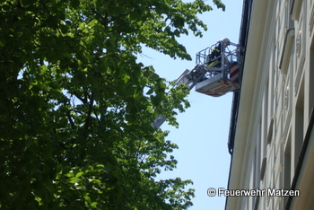 Inzwischen wurde im 3.Stock eine Person gefunden und die Rettung mittels Drehleiter begonnen. Der ATS-Trupp Matzen musste zur Unterstützung des Trupps im 3.Stock los eilen, um bei der Rettung behilflich zu sein.