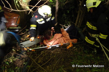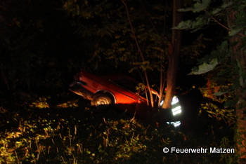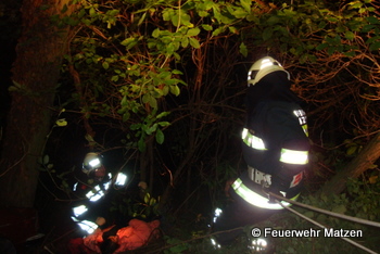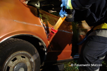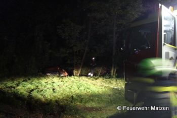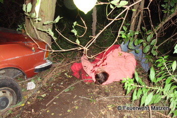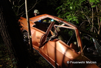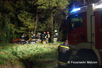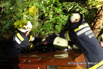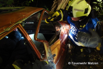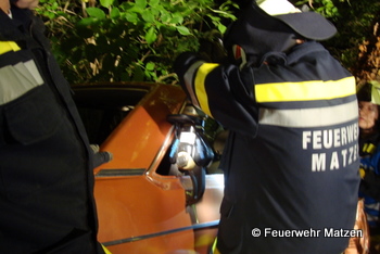 Um 19 Uhr wurde rückte die Feuerwehr Matzen mit 18 Mann und 2 Fahrzeugen zu einer Übung auf die Schloßstraße aus. Ein Pkw kam in der Kurve direkt vor dem Matzner Schloß von der Straße ab und prallte in Folge gegen einen Baum in der Böschung. Das Unfallfahrzeug kam in Schräglage zum Stillstand. Die Fahrerin wurde dabei im Fußbereich eingeklemmt, wobei die Beifahrerin aus dem Fahrzeug geschleudert wurde.