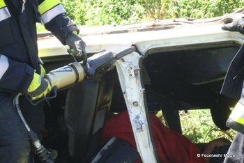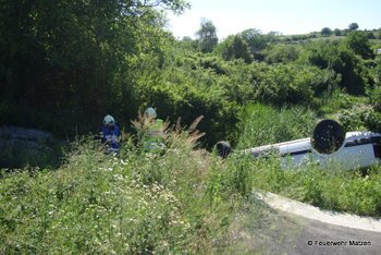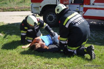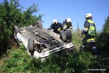 Kurz nachdem sich einige Kameraden zum Tarokieren im Lehrsaal einfanden, vibrierten gleichzeitig alle Handys und alarmierten zum ersten Einsatz des 24 Stunden Tages. Florian Mistelbach meldet VU eingekl. Person (T2) Auffangbecken Richtung Scheibenberg(16:07 16.6) erschein auf den Displays aller Teilnehmer. Unverzüglich rüsteten sich alle mit der persönliche Schutzausrüstung aus und rückten zum Unfallort aus. Dort angekommen lief dem Einsatzleiter eine hysterische Unfallbeteiligte in die Arme und schilderte den Unfallhergang und teilte ihm mit, dass noch 2 Personen verletzt sind. Bei der Erkundung wurde eine Person einige Meter neben dem Fahrzeug mit Verletzungen unbestimmten Grades und eine im Fahrzeug eingeklemmte Person vorgefunden. Unverzüglich wurde die beiden Fahrzeugbesatzungen eingeteilt. Nur Augenblicke später war die Zugangsöffung geschaffen und die Person im Fahrzeug konnte betreut werden. Nach der Sicherung gegen weiteres Abrutschen des Fahrzeuges konnte mit der Menschenrettung begonnen werden. Mittels Schaufeltrage wurden beide Personen aus dem Gefahrenbereich gebracht. Nachdem alle Personen erstversorgt und das Fahrzeug geborgen wurde, konnten die Einsatzkräfte wieder abrücken.