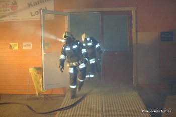 Bis um 23:44 Uhr lauter verschiedene Klingeltöne im ruhigen Raum erhallten. „Brandeinsatz am Sportplatz mit vermissten Personen“ war die Alarmierung zum 2. Einsatz des Tages. Kurz zuvor noch im Tiefschlaf rüsteten sich die Florianijünger mit ihrer Schutzausrüstung aus. Nur kurz darauf rückte auch schon das erste Fahrzeug ab. Bei der Erkundung wurde starke Rauchentwicklung in der Kantine am Sportplatz wahrgenommen. Der Einsatzleiter ordnete die Menschenrettung unter Atmeschutz und das Schützen des angrenzen Waldes an. Nur wenige Minuten nach Eintreffen der Einsatzkräfte wurde auch schon die erste Person im Brandobjekt gefunden. Um die Suche zu erleichtern rückte der zweite Trupp gleichzeitig mit der Drückbelüftung vor. Auch dieser Trupp konnte eine Person aus dem Gebäude retten. Nachdem Brand Aus gegeben wurde, konnten die Einsatzkräfte wieder abrücken und um ca 1:30 Uhr ihre Betten aufsuchen.