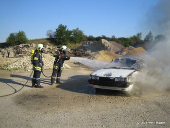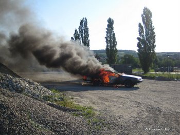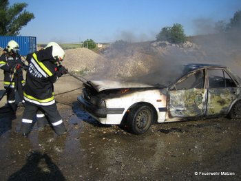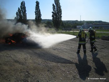 Doch lange dauerte die Ruhe nicht. Um 7:11 schrillten der Alarm durchs Feuerwehrhaus „Fahrzeugbrand“. Ein weiteres Mal rüsteten sich die Teilnehmer aus und rückten mit Rüstlöschfahrzeug und Kommandofahrzeug zum Einsatzort am Gewerbegebiet ab. Schon von weitem war die Rauchsäule zu erkennen. An der Einsatzstelle angekommen, wurde ein Pkw in Vollbrand vorgefunden. Unter Atemschutz wurde die Brandbekämpfung des Fahrzeuges mittels Hochdruck begonnen. Zeitgleich wurde die Löschwasserversorgung sichergestellt. Um ein weiteres Aufflakern des Brandes zu verhinder wurde der PKW mit einer Schaumdecke abgedeckt. Nach rund einer Stunden rückten die Teilnehmer wieder ein. Daheim erwartete die 16 ausgerückten Kameraden schon das wohlverdiente Frühstück. Bei weichen Eiern, Schinken, Käse, warmen Semmeln und auch Kuchen wurden die Mägen gefüllt. Natürlich wusste zu dieser Zeit noch niemand wie lange die Ruhe anhält.