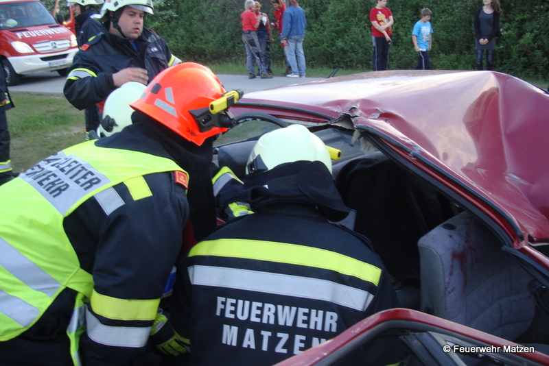 Der Einsatzleiter fand einen Zusammenstoss zwischen einem PKW und einen mit Ladetätigkeiten beschäftigten LKW mit insgesamt 5 Verletzte vor, wobei 3 im Fahrzeug und eine unter einem Baumstamm eingeklemmt waren. Die Feuerwhehr Raggendorf kümmerte sich inzwischen um die erste Person aus dem PKW und begann gleichzeitig mit der Menschenrettung der Person unter dem Holzstamm und den vermissten Fahrer des LKWs. Zeitgleich wurde von der Feuerwehr Matzen die Menschenrettung der beiden restlichen Personen des PKWs vorbereitet. Mittels hydraulischen Bergesatz wurde eine Rettungsöffnung geschaffen.