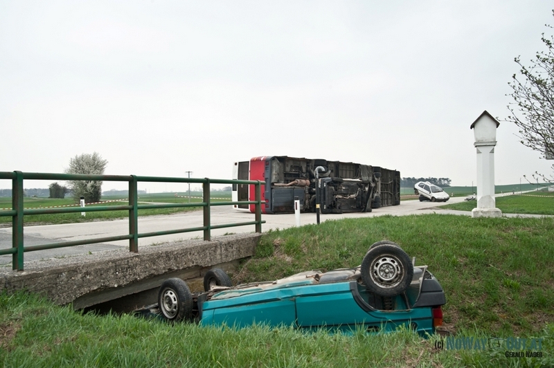 Ein Autobus, in dem sich zirka 35 Personen befanden, kollidierte im Kreuzungsbereich der L3159 und einem Feldweg mit einem PKW und kam auf der Seite zu liegen. Durch ein Ausweichmanöver überschlug sich hinter dem Autobus ein PKW und landete Dachseitig in einem ausgetrockneten Bachbett. Auf der Gegenfahrbahn kam es durch eine Notbremsung zu einem Auffahrunfall zweier Fahrzeuge. Ein mit 2 Personen besetztes Fahrzeug konnte nicht mehr rechtzeitig bremsen und krachte in den Vordermann. Der Lenker eines nachkommenden Motorfahrrades ist durch den Anprall erschrocken und schleuderte in Folge gegen einen Begrenzungspfeiler.