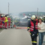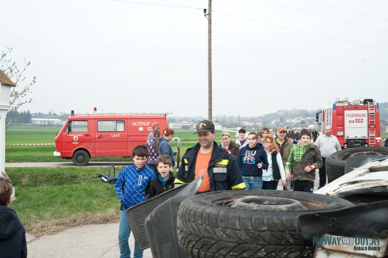20. April 2013 Vormittag, mittels 4 Rüstlöschfahrzeugen wurde der Linienbus auf die Seite gekippt und die Unfallfahrzeuge positioniert und vom Gemeindebagger präpariert. Gleichzeitig verausgabte sich das Realistikteam des Roten Kreuzes mit den Übungsdarstellern. Im Anschluss wurden die Unfallopfer in den Wracks positioniert und die beteiligten Feuerwehren warteten auf die Alarmierung.