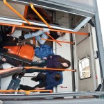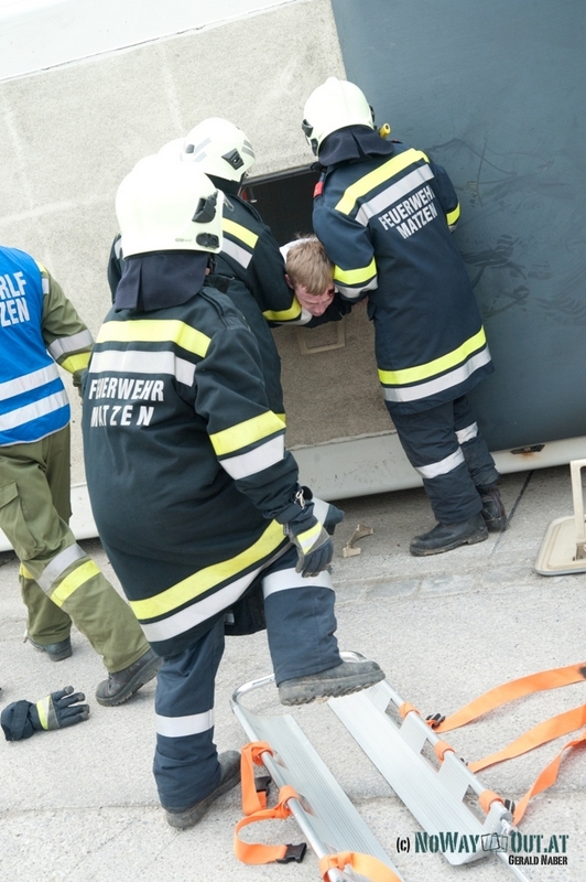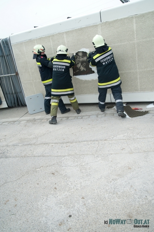 Unverzüglich begann die Mannschaft des RLF Matzen mit der Schaffung der Zugangsöffnung durch die Heckscheibe des Autobusses. Im Anschluss wurden mittels Force Gerät und Glasmaster am Dach des Busses zusätzlich Rettungsöffnungen gesägt. Zeitgleich wurde der Brandschutz aufgebaut und der Bus gegen Verrutschen gesichert.
