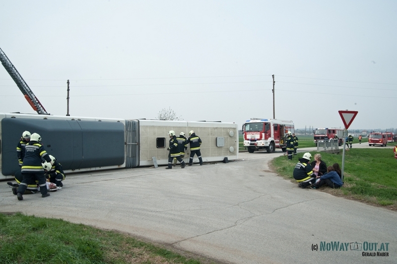 Um 14:53 erfolgte die Alarmierung der Feuerwehren Matzen, Raggendorf, Schönkirchen-Reyersdorf, Spannberg und Angern an der March durch die Feuerwehrleitstelle in Mistelbach zu einem Autobusunfall. Kurz nach dem Alarm rückten 19 Kameraden der Feuerwehr Matzen mit 3 Fahrzeugen zur Unfallstelle aus. Der Einsatzleiter BM Rennthaler Roman erkundete die Einsatzstelle und beauftragte den Gruppenkommandanten des Rüstlöschfahrzeuges mit der Menschenrettung der Businsassen. Der GrpKdt des Kommandofahrzeuges bekam den Auftrag zur Errichtung der Einsatzleitung. Gleichzeitig mit den Feuerwehren wurde der Katastrophenzug des Roten Kreuzes zu einem Massenanfall von Verletzten alarmiert.