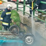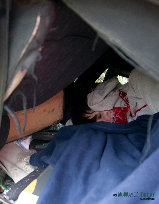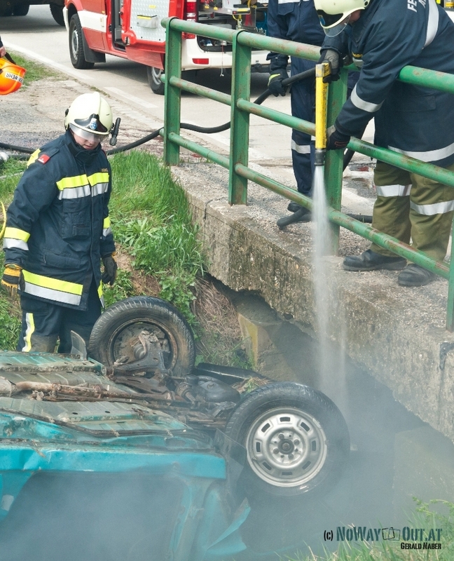 Durch die schwierige Lage und enormen Verletzungen mußte die Eingeklemmte aus dem Unfallwrack im Bach achsengerecht durch die Beifahrertür gerettet werden.