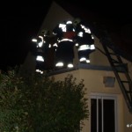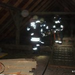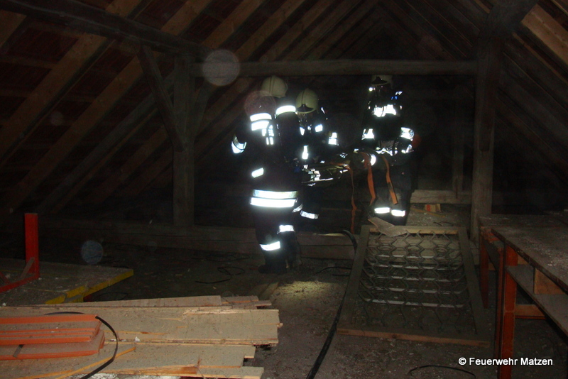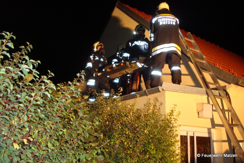 Nur wenige Augenblicke später rückte der Atemschutztrupp bereits ins Innere des Dachbodens vor. Eine Person lag bewußtlos am Boden. Mittels Schaufeltrage wurde diese über die Leiter ins Freie gebracht und erstversorgt.