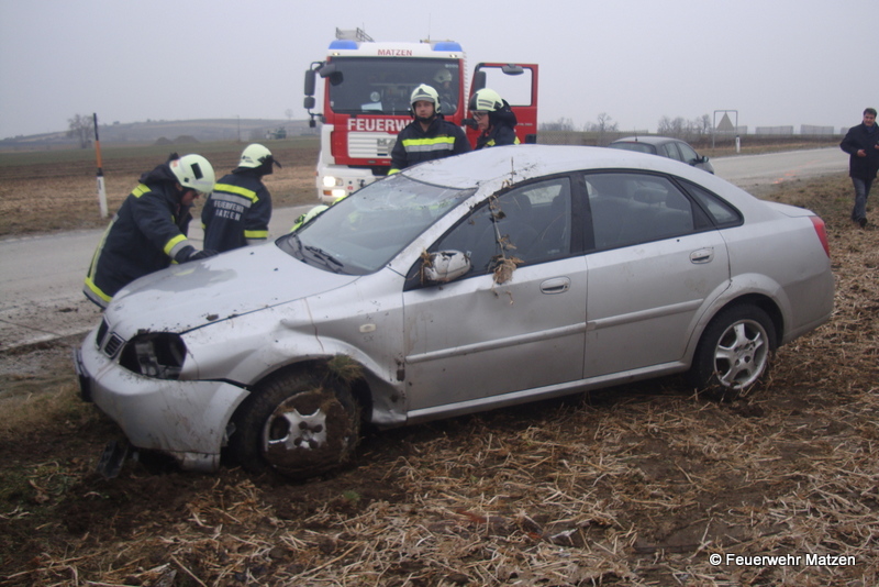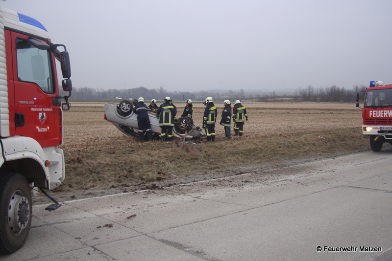 Nur wenige Minuten nach der Alarmierung rückten 9 Mann mit dem RLF Matzen zur Unglücksstelle aus. Nach der Erkundung mit der gleichzeitig eingetroffenen Nachbarfeuerwehr, wurde die Vorgehensweise abgesprochen und die Unfallstelle unverzüglich abgesichert. Der leicht verletzte PKW-Lenker wurde bereits vom Roten Kreuz erstversorgt. Nach der Freigabe durch die Polizei wurde das Fahrzeug durch das RLF Matzen wieder auf die Räder und mittels Seilwinde des RLF Schönkirchen auf die Straße gezogen. Nachdem alle ausgelaufenen Flüssigkeiten gebunden und die Verkehrsflächen gereinigt wurden, konnte die Feuerwehr Matzen wieder abrücken. Die Feuerwehr Schönkirchen-Reyesdorf konnte nachdem gesichertem Abstellen des Unfallwrack ebenfalls wieder einrücken. Nach rund 90 Minuten konnte die Einsatzbereitschaft wieder hergestellt werden.