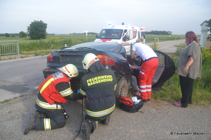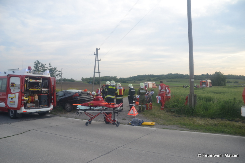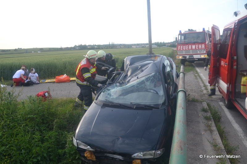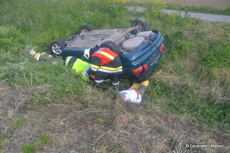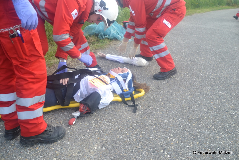 Umgehend wurde die Mannschaft des RLF Matzen zur Menschenrettung des im Bachbett befindlichen PKWs abgestellt. Parallel dazu wurden die Wiederbelebungsversuche bei dem einen Verletzten eingeleitet, und alle anderen Unfallopfer betreut. Nach Eintreffen des Tanklöschfahrzeuges aus Kleinharras unterstützen diese die Kameraden aus Matzen bei der Rettung und Versorgung der Verletzten.